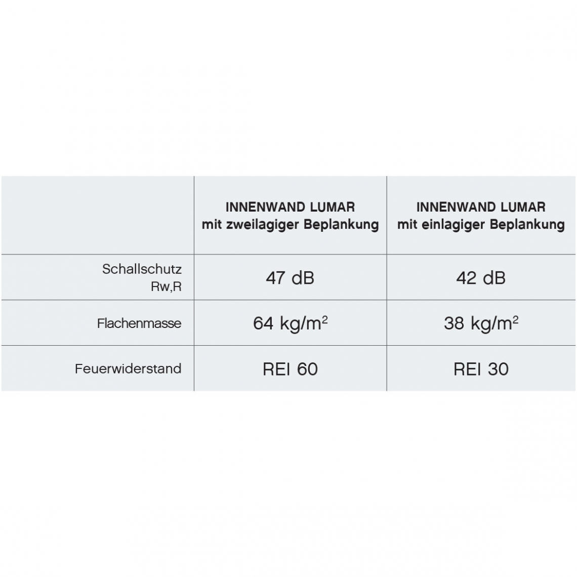 Aufgrund der größeren Masse ist die Schalldämmung der Lumar Innenwand um 5 dB besser als eine Referenzwand, wodurch die Lumar Innenwand im Bereich des Schalllschutzes einen Spitzenplatz einnimmt. Neben dem ausgezeichneten Schallschutz bietet Ihnen die Lumar Innenwand auch ausgezeichneten Brandwiderstand (60 Minuten), während der Brandwiderstand einer Wand mit einlagiger Beplankung nur 30 Minuten beträgt.