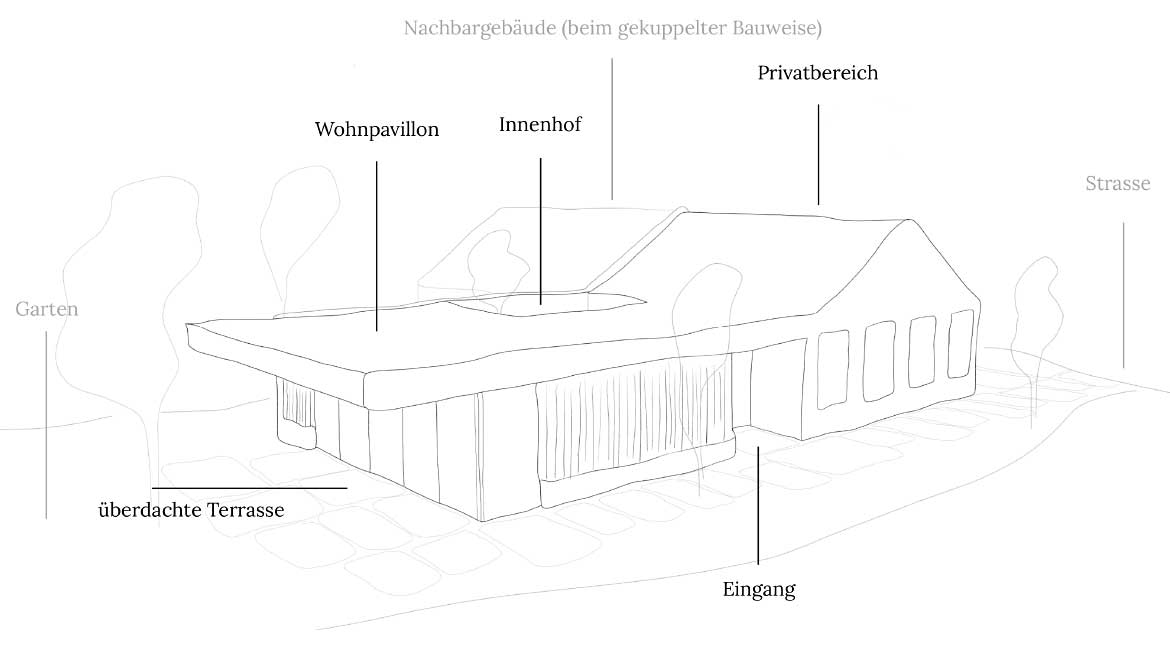 Der straßenseitig gelegene Teil passt sich mit seiner eher traditionell gehaltenen Form dem Umfeld an. Der Teil, der in den Garten ragt, ist offener, eignet sich für große Fensterflächen und weist die Form eines zeitgemäßen Wohnpavillons auf. Durch seine smarte und schlanke Form eignet sich das Haus besonderes für langgezogene und schmale Grundstücke.