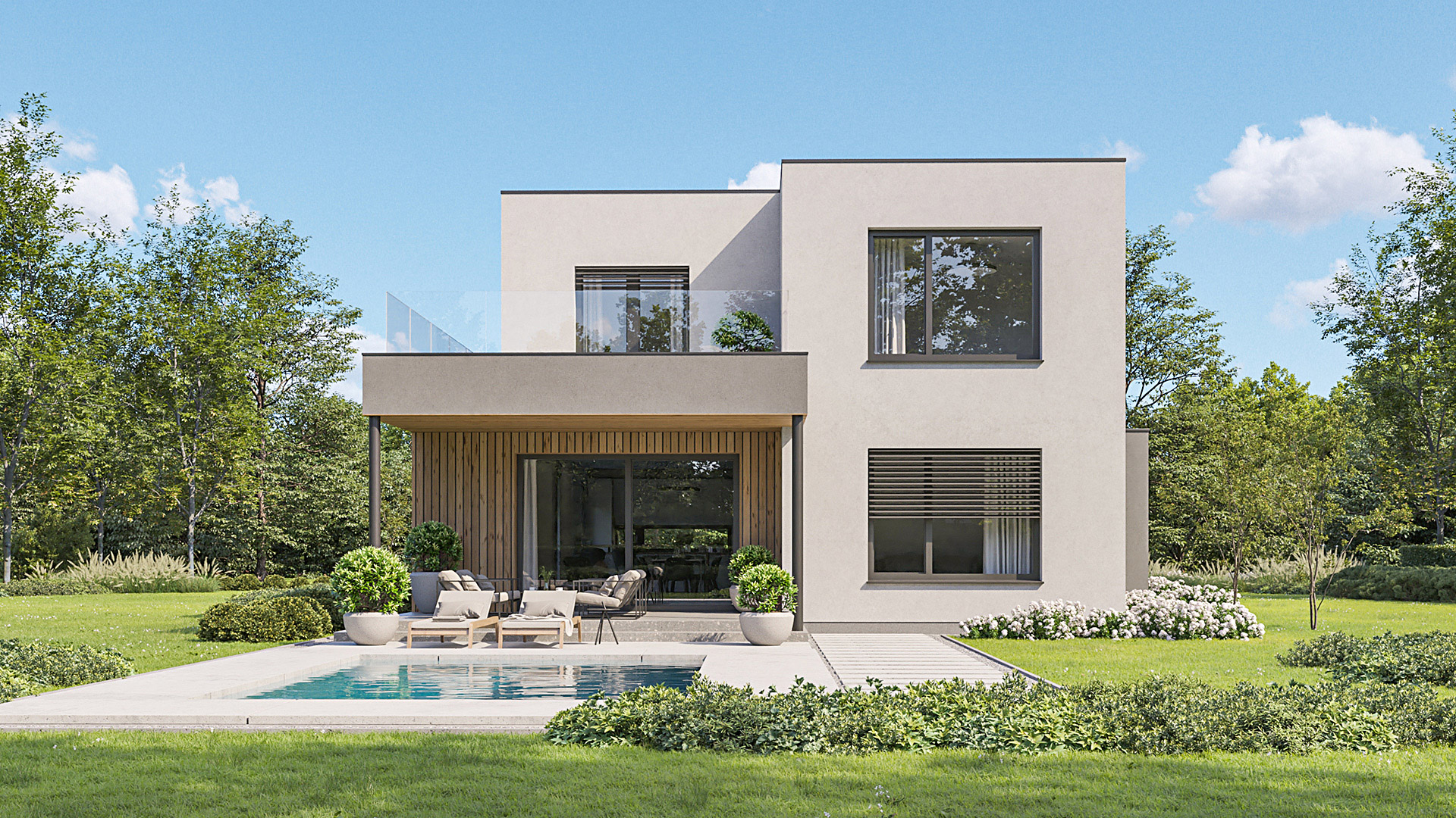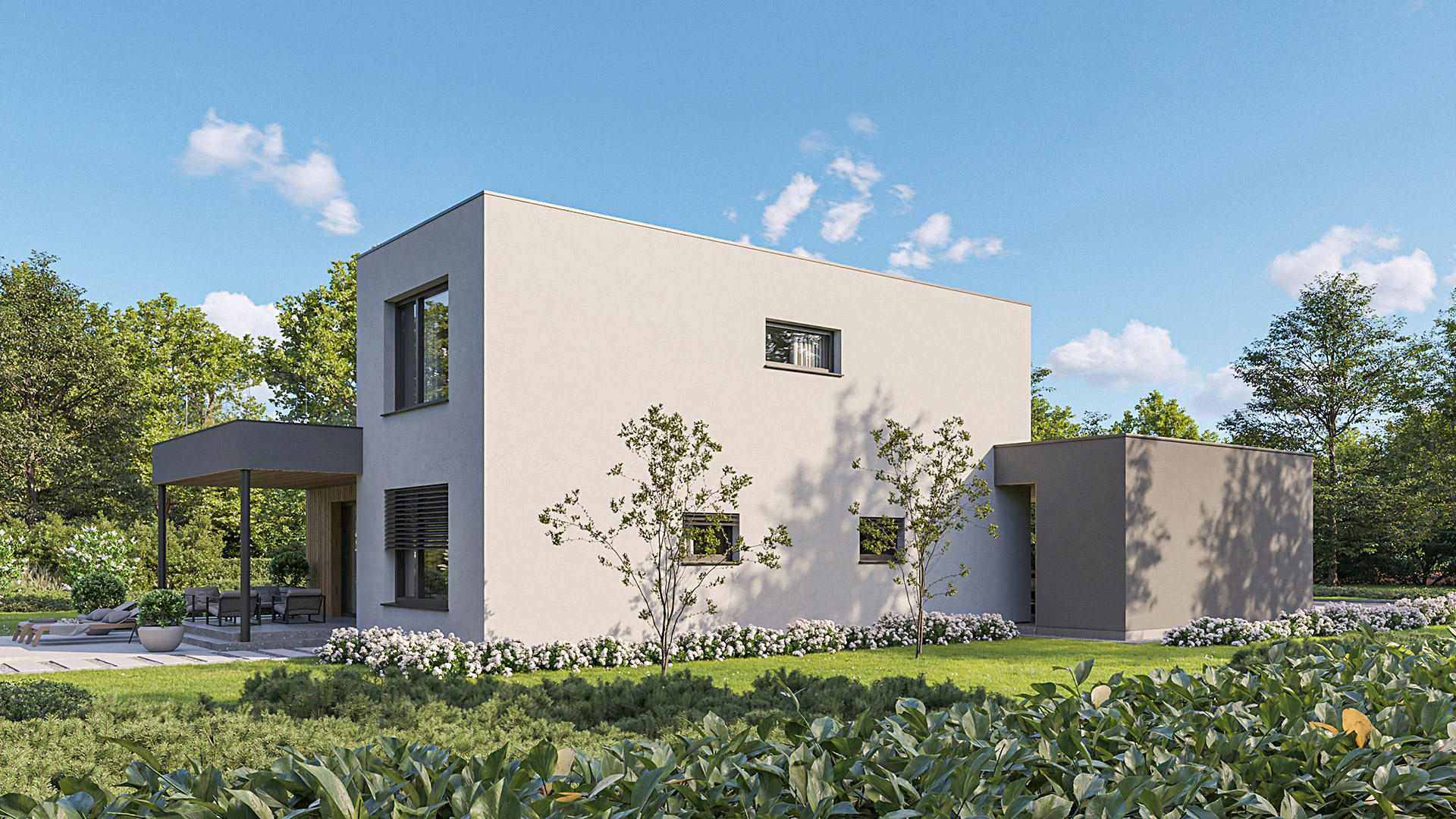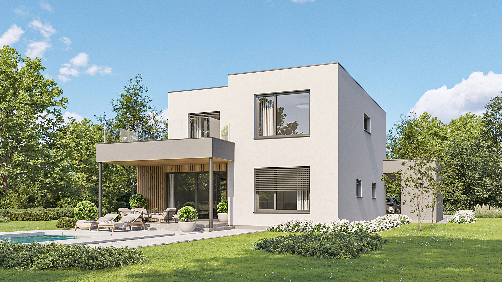 Die Gestaltung des Erdgeschosses zeichnet sich durch eine Trennung der funktionalen Bereiche aus. Großzügigkeit vermittelt bereits der Eingangsbereich. Die Küche und das Esszimmer können vom Wohnzimmer getrennt werden und ermöglichen dadurch eine ruhige Rückzugsmöglichkeit. Das Obergeschoss bietet sogar einer 5-köpfigen Familie eine gemütliche und durchdachte Raumaufteilung. Ein eigener Elternbereich besticht durch Schlafzimmer mit begehbarem Schrankraum und einem großzügigen Bad. Ein weiteres Bad ist den 3 Kinderziemmern zugeteilt. Eine Dachterrasse erweitert im Sommer den Lebensraum im Obergeschoss.