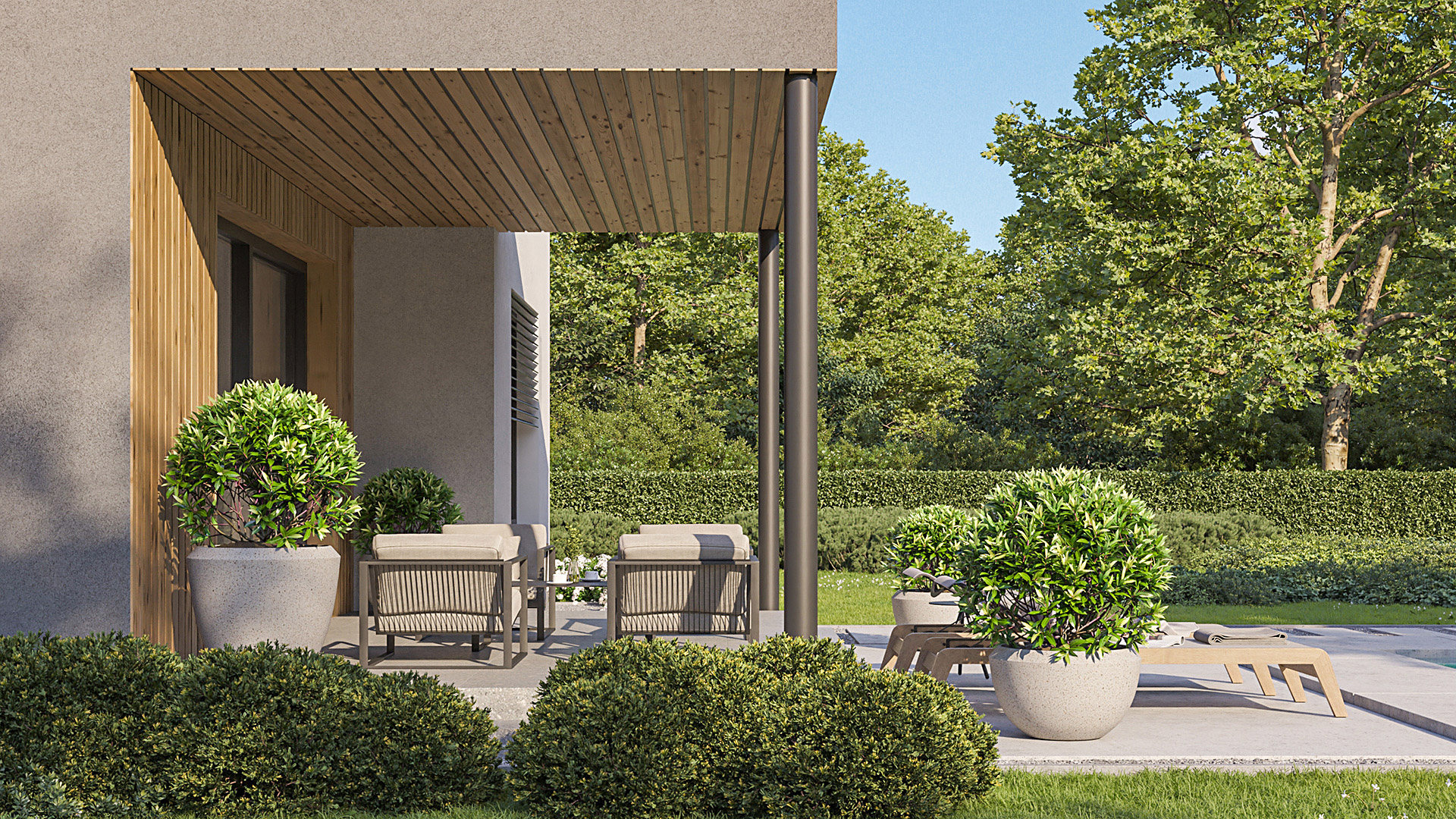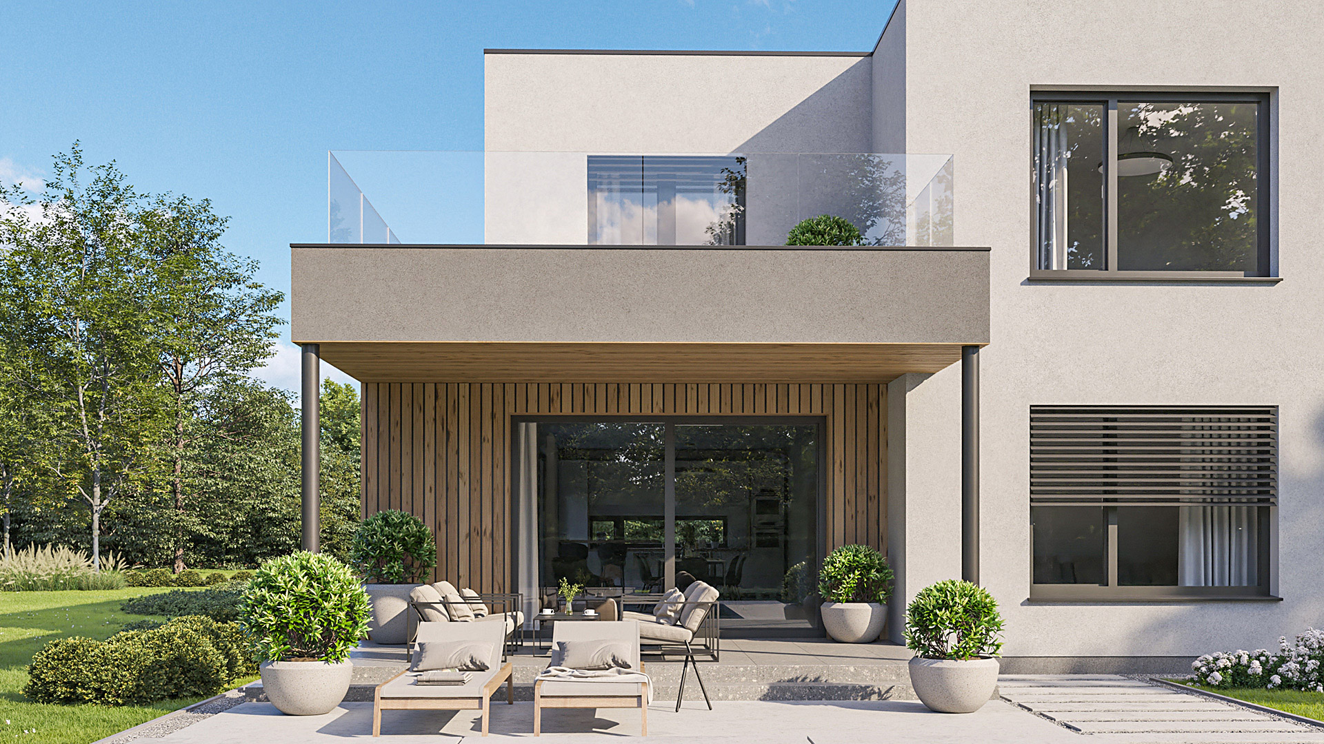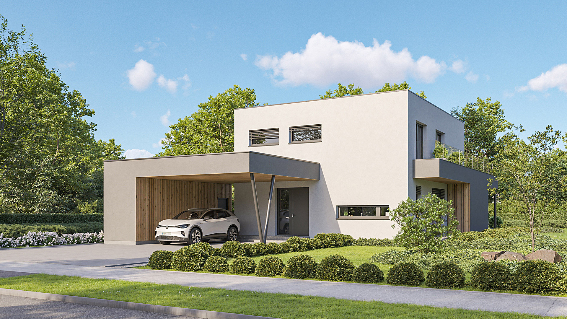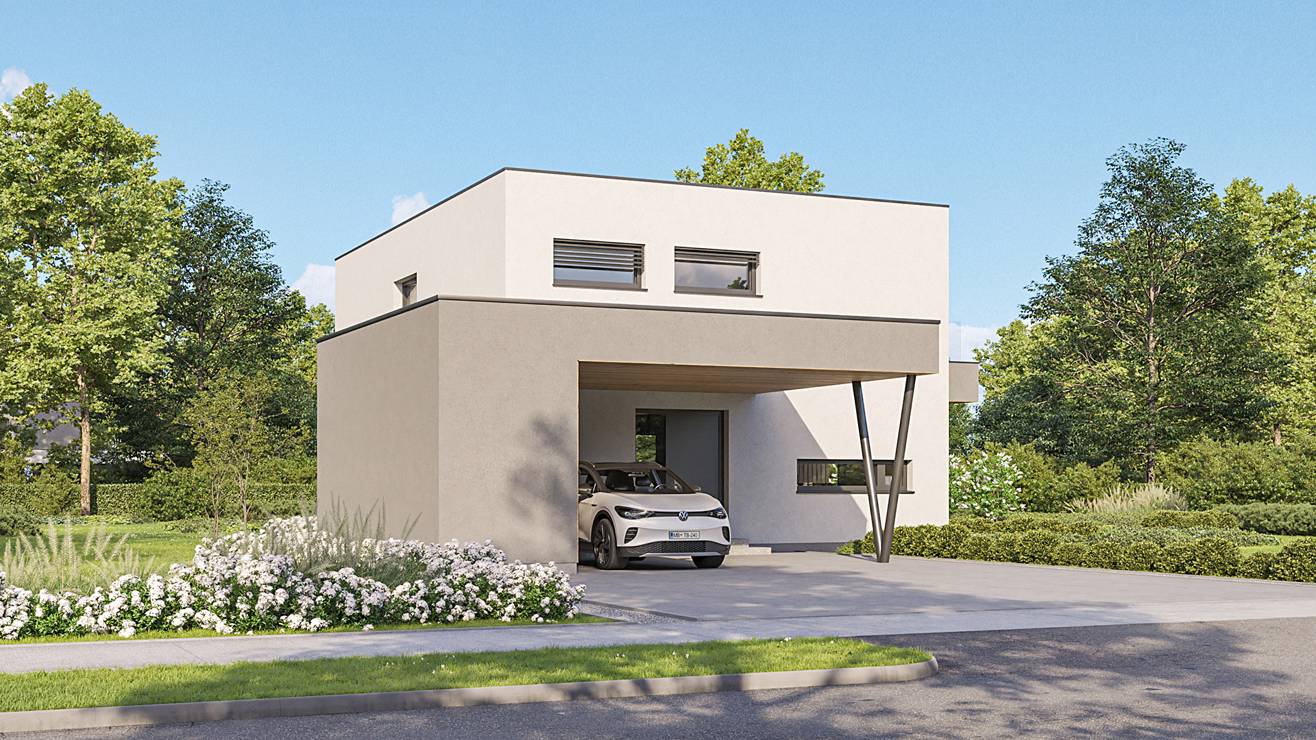 Die Gestaltung des Erdgeschosses zeichnet sich durch eine Trennung der funktionalen Bereiche aus. Großzügigkeit vermittelt bereits der Eingangsbereich. Die Küche und das Esszimmer können vom Wohnzimmer getrennt werden und ermöglichen dadurch eine ruhige Rückzugsmöglichkeit. Das Obergeschoss bietet sogar einer 5-köpfigen Familie eine gemütliche und durchdachte Raumaufteilung. Ein eigener Elternbereich besticht durch Schlafzimmer mit begehbarem Schrankraum und einem großzügigen Bad. Ein weiteres Bad ist den 3 Kinderziemmern zugeteilt. Eine Dachterrasse erweitert im Sommer den Lebensraum im Obergeschoss.