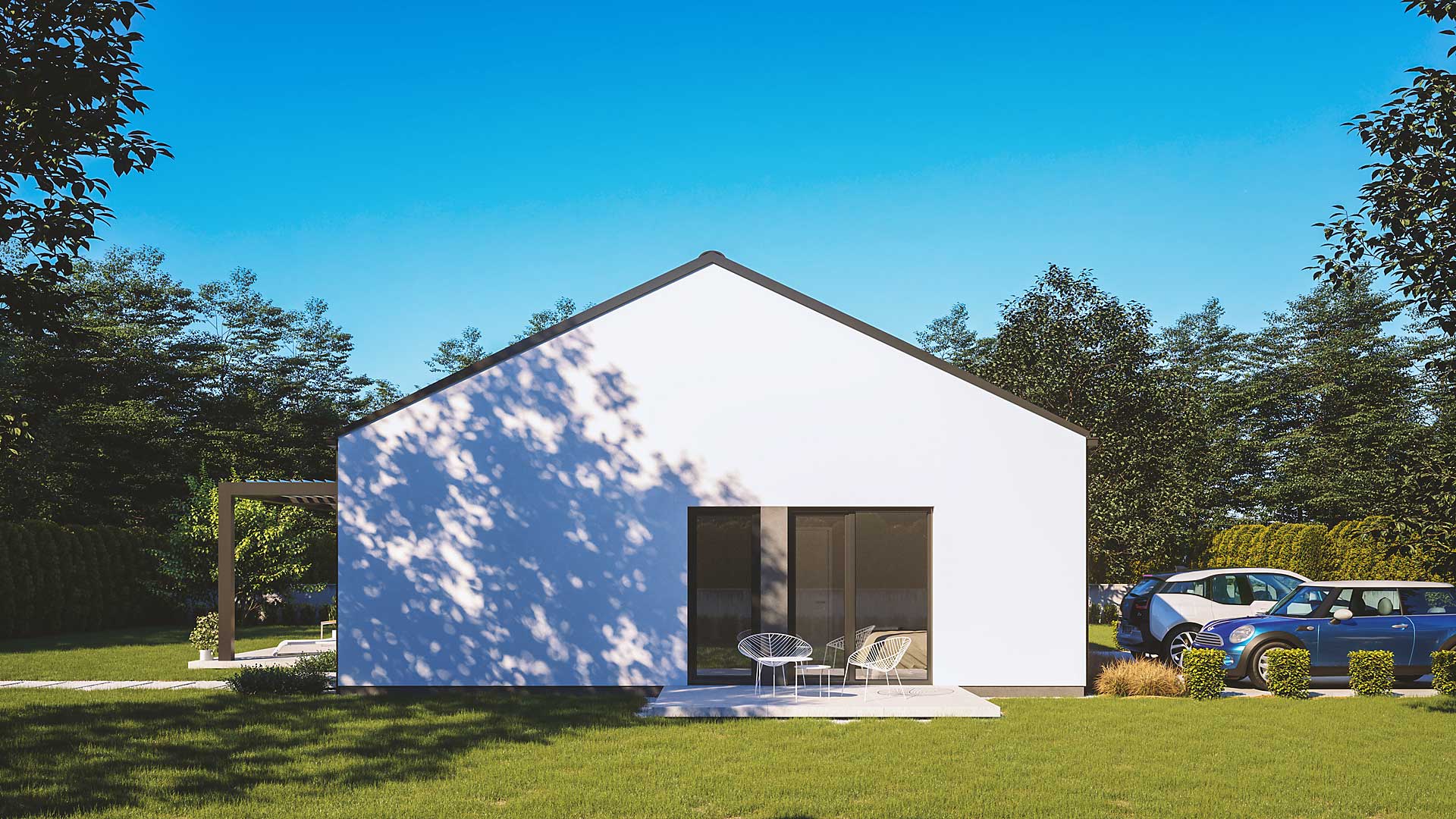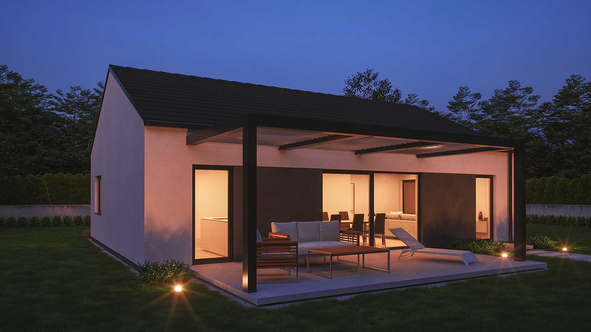 Das Haus ist wie geschaffen für Familien und alle, die ihr Zuhause und die Sonne gern den ganzen Tag genießen. Das ebenerdige, langgestreckte Haus ist so konzipiert, dass es bei südseitiger Ausrichtung die Sonneneinstrahlung bestmöglich ausnutzt. Auf diese Weise sind alle Wohnräume, einschließlich der beiden Kinderzimmer, – je nach Jahreszeit – vom frühen Vormittag bis zum späten Nachmittag ausgiebig lichtdurchflutet.
