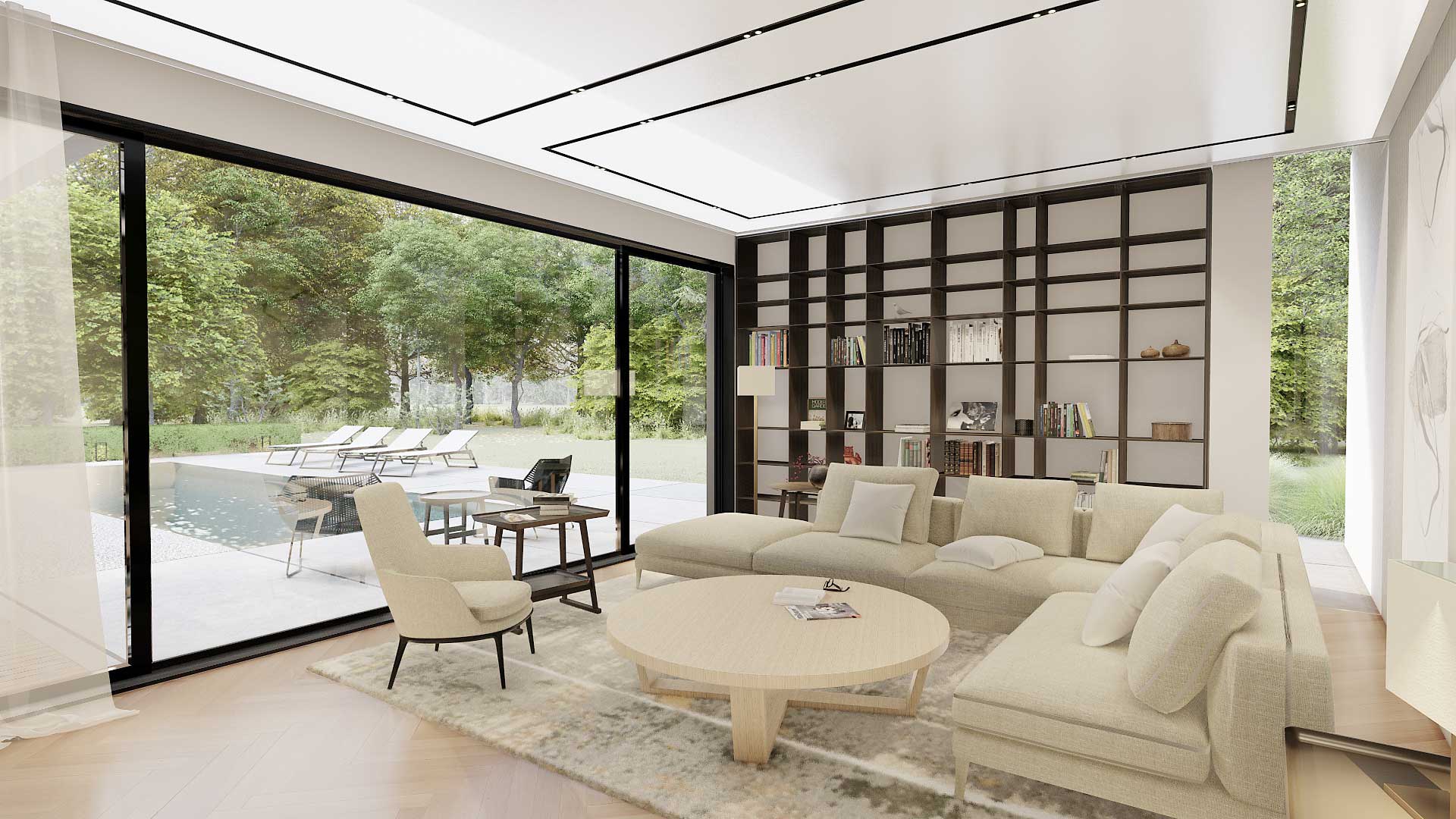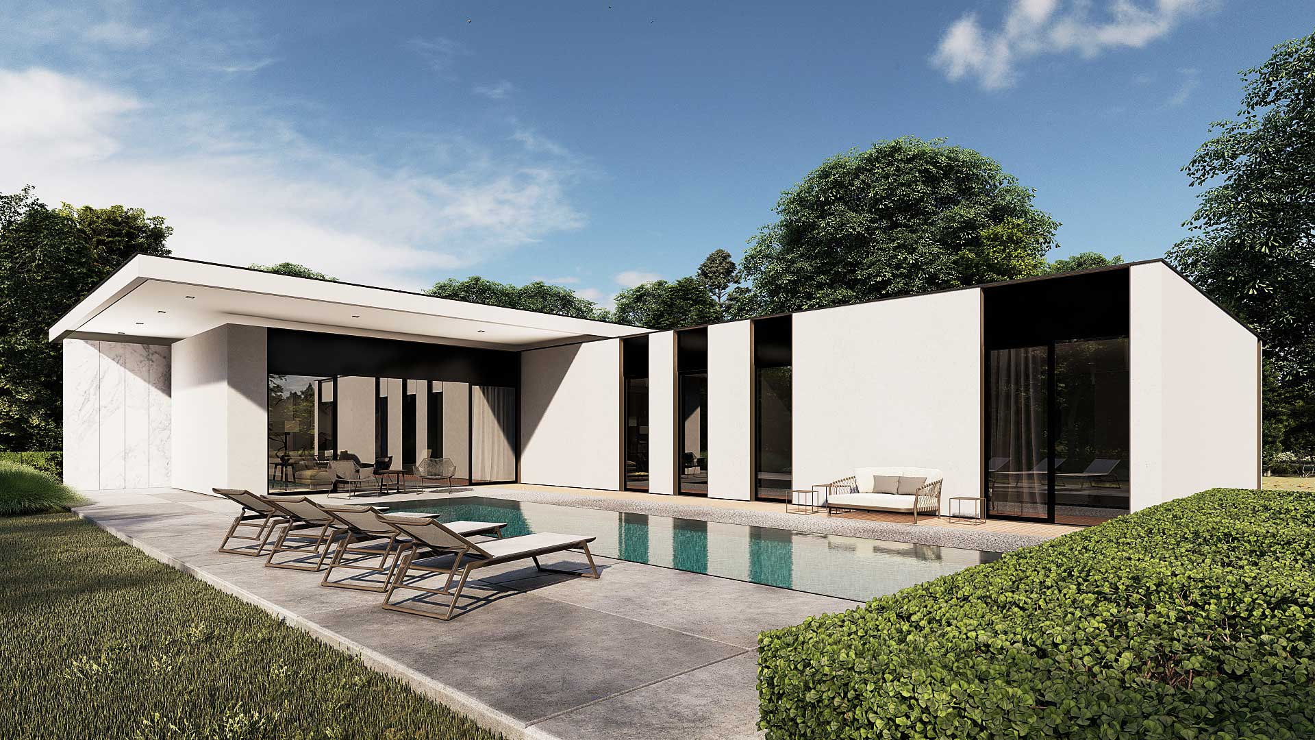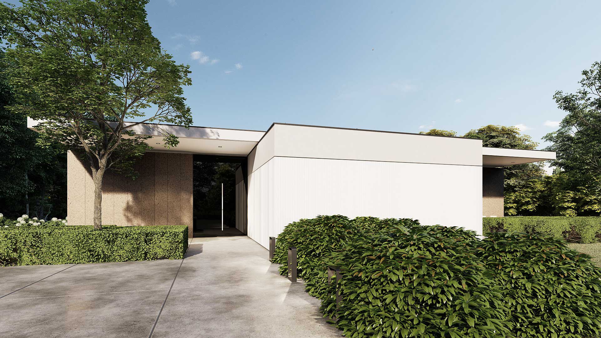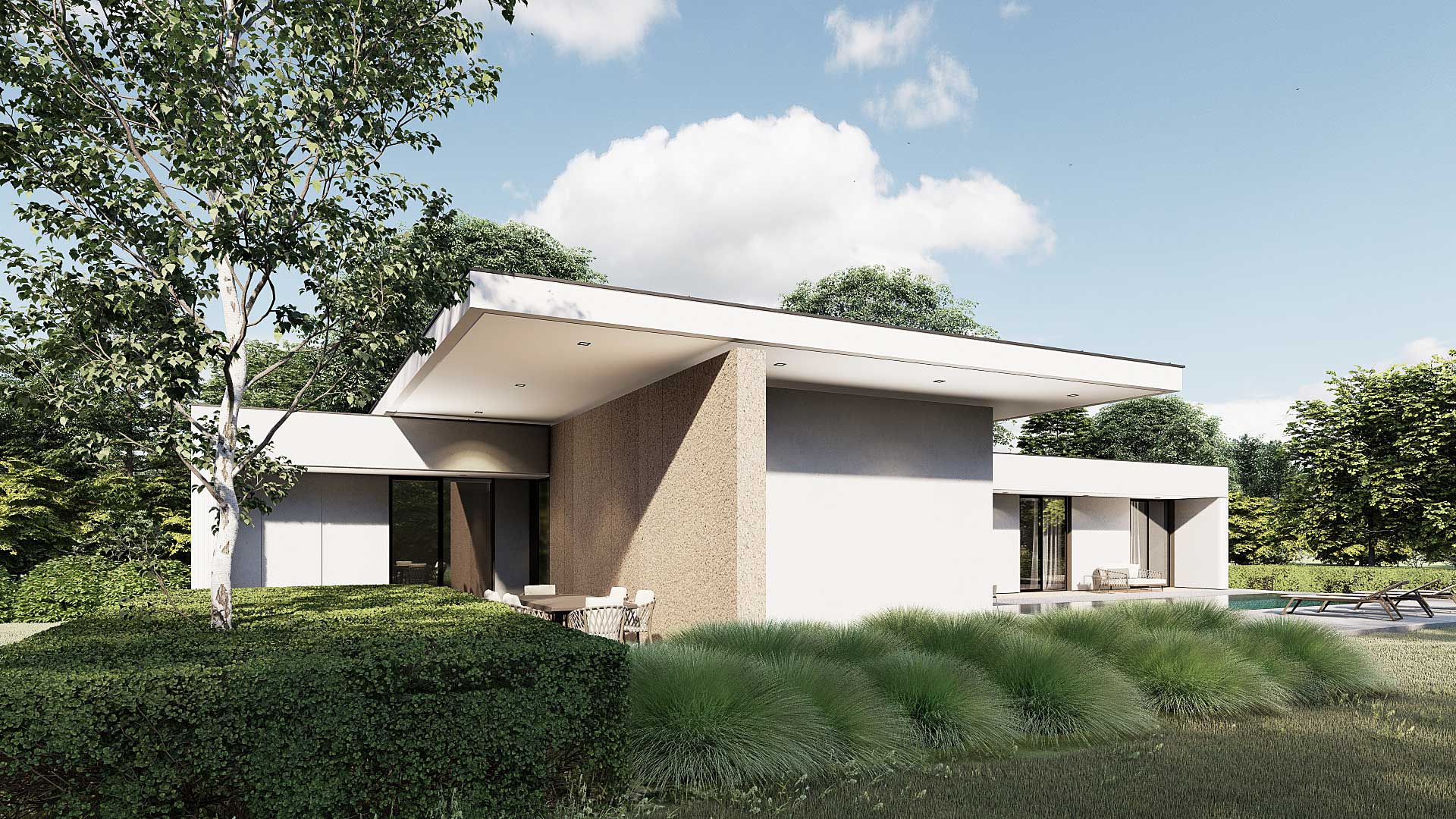 Der rechteckige Entwurf orientiert sich zum den Garten. Der Eingangsbereich gibt die Raumstruktur vor. Der Wohnraum erstreckt sich weiter nach Süden und bietet den Blick in den Garten. Die Schlafräume verlaufen rechtwinklig nach Osten und sind auch auf die südliche Gartenlandschaft ausgerichtet. Der große zentrale Raum mit einer tiefen Nische bietet verschiedene Möglichkeiten, um sich zu unterhalten und Freizeit zu verbringen. Die Küche ist direkt mit der Terrasse und dem Kräutergarten verbunden. Eine zusätzliche Qualität aller Wohnräume sind die überdachten Terrassen, die einen Zwischenraum zwischen Innenraum und Natur darstellen. Die Gestaltung der Umgebung schafft zusammen mit dem Gebäude eine Harmonie mit unterschiedlichem Ambiente.