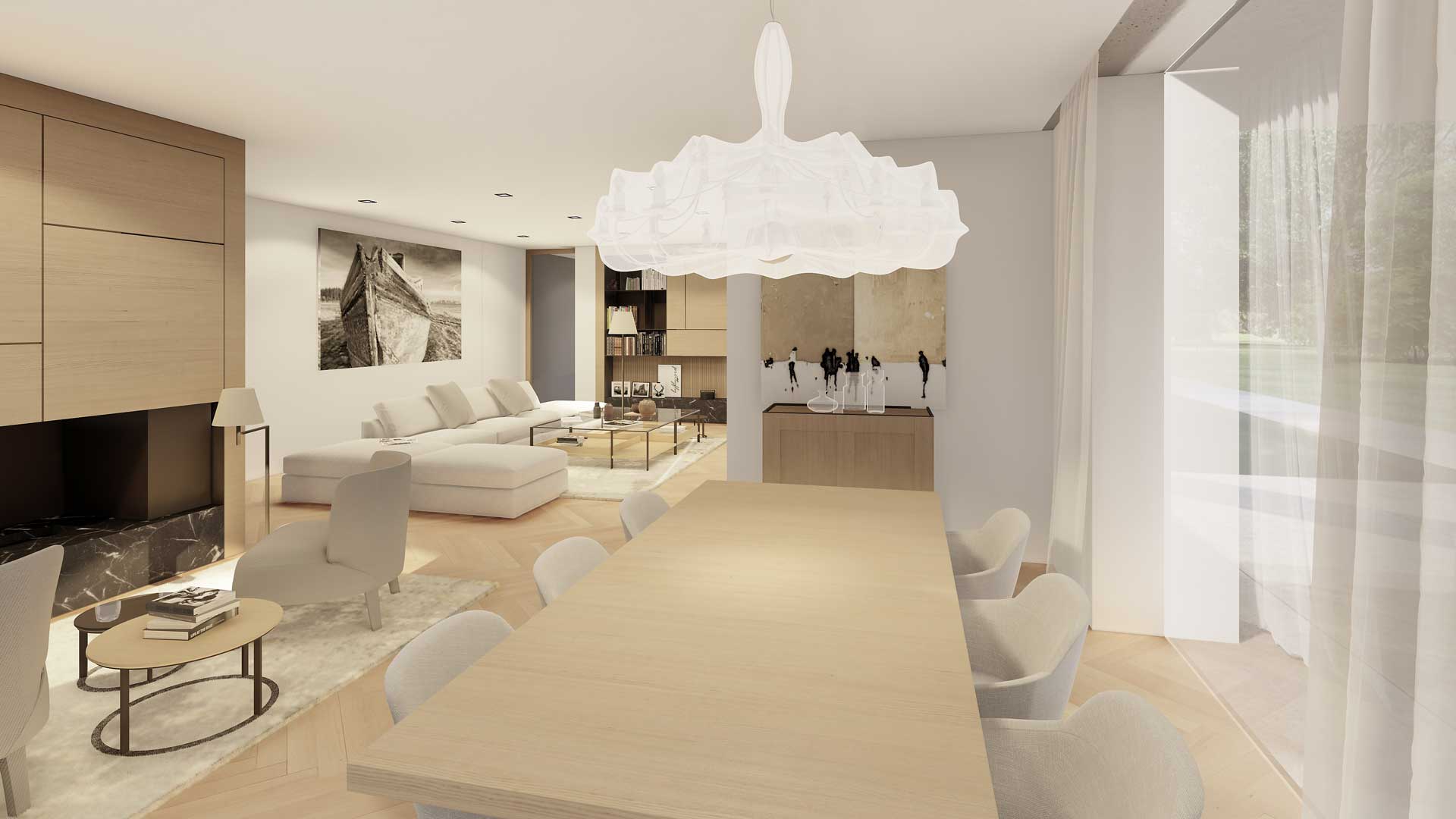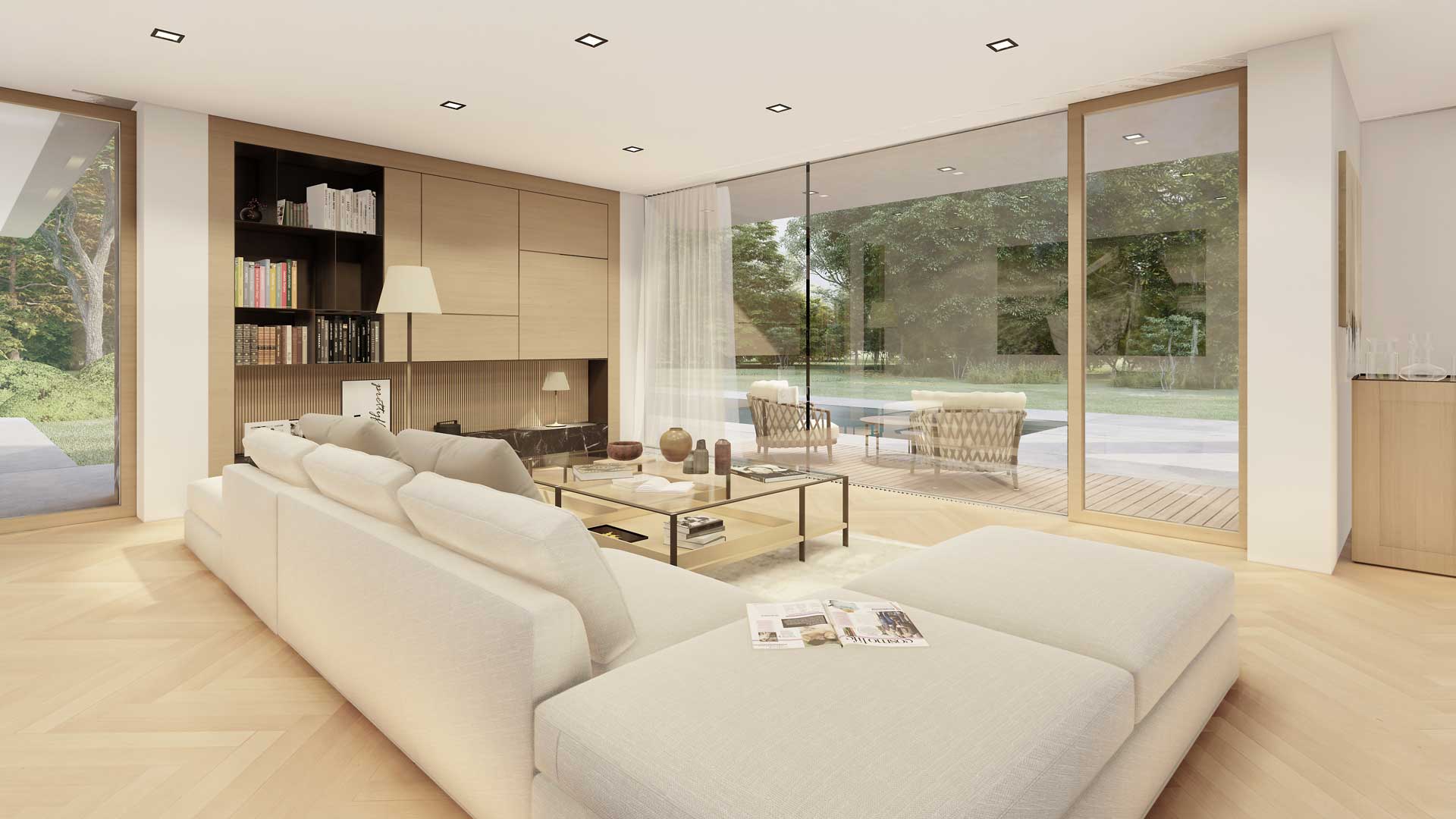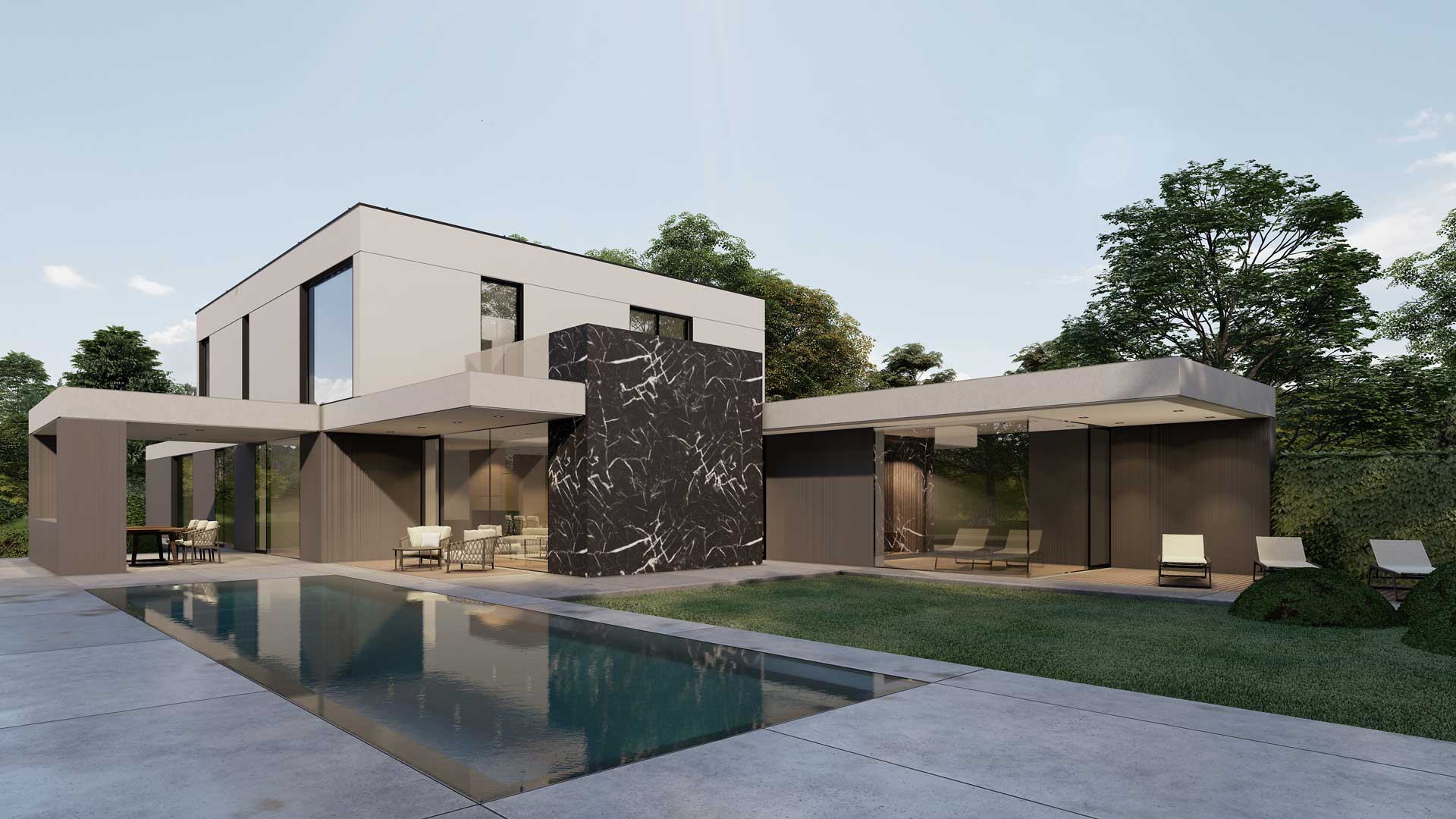 Der gegliederte zweigeschossige Entwurf ergibt sich aus der Verbindung zum Garten. Das Erdgeschoss ist für den Wohnraum vorgesehen, das Obergeschoss verfügt über die Schlafräume. Die Ausrichtung erstreckt sich nach Süden und Osten. Schon beim Betreten, schafft der zweigeschgossige Raum ein besonderes Erlebnis. Die Treppen sind so konzipiert, dass ein Aufzug problemlos in der vertikalen Öffnung errichtet werden kann. Der zentrale Wohnbereich verfügt über einen zweigeschossigen Atriumbereich mit einer grünen Wand und einem Wassermotiv. Es stellt den Kern des Hauses dar und bietet Belichtung, eine klangliche Kulisse und viel Grün im Herzen des Gebäudes. Die Küche kann nach Bedarf geschlossen werden und öffnet sich zur Sommerküche und zum zentralen, überdachten Wohnbereich. Im Erdgeschoss befindet sich auch ein Wellnessbereich mit einem Fitnessraum, welches eine direkte Verbindung zum Garten und zum Wassermotiv bietet. Die Gestaltung der oberen Etage ist flexibel nach den Wünschen der Bewohner. Die Gestaltung der Umgebung schafft zusammen mit dem Gebäude unterschiedliche Ambiente.