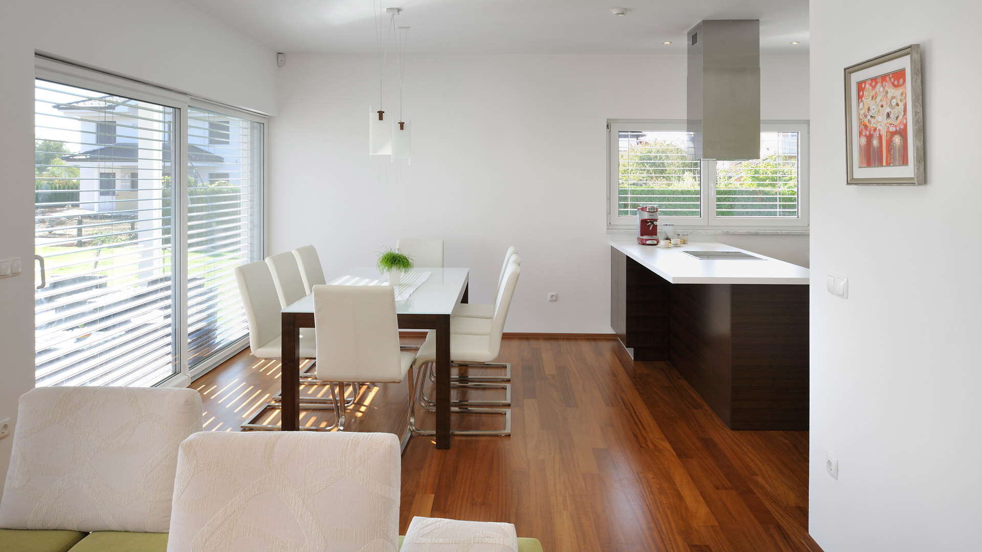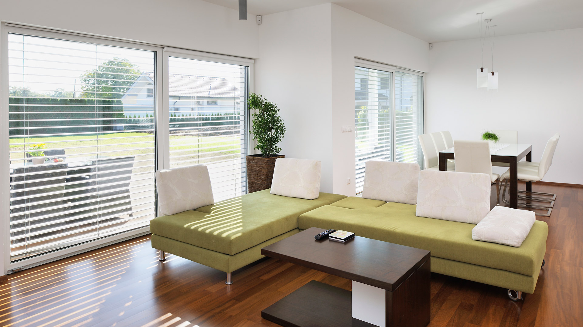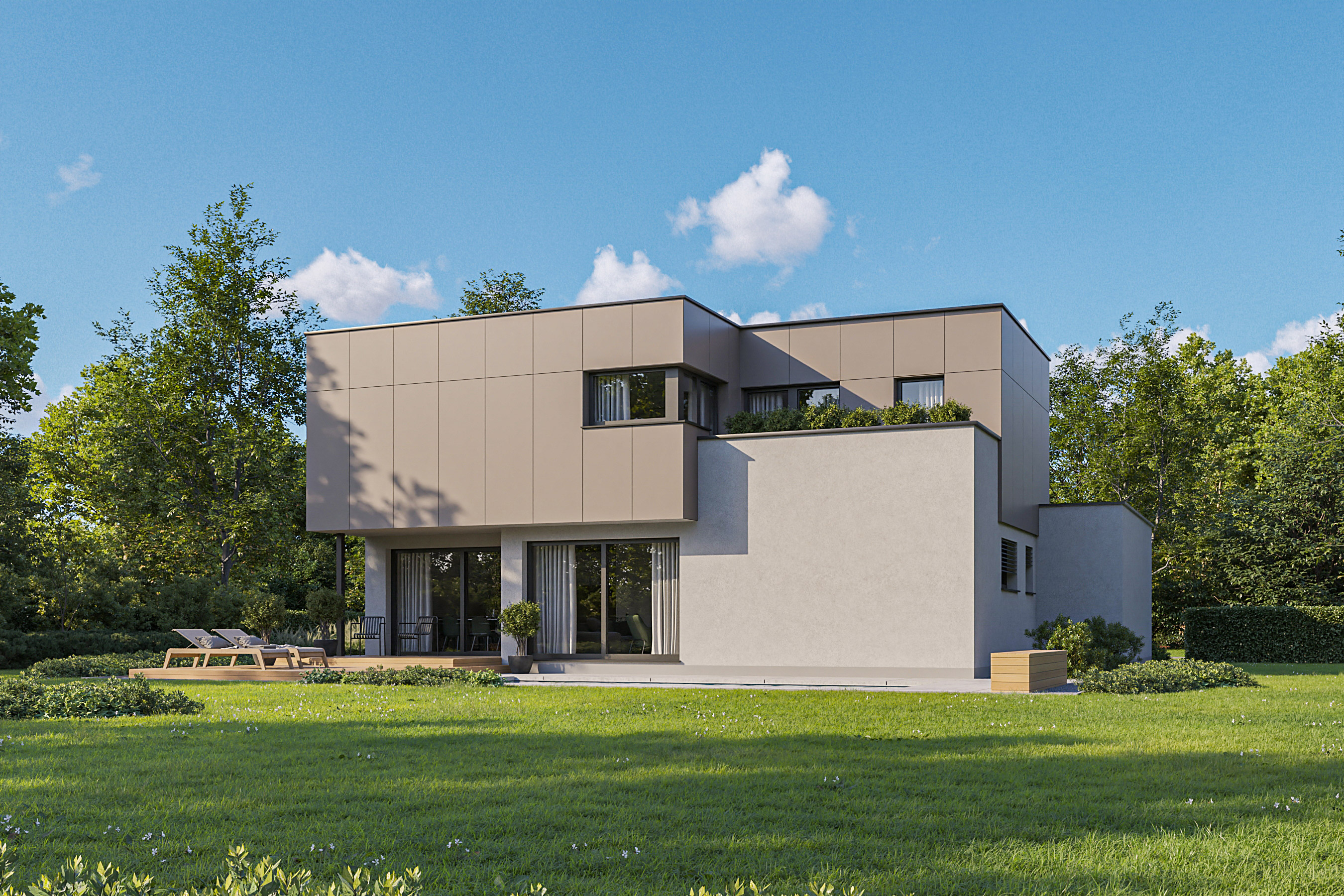 Zusätzlich zu seiner modernen Architektur besticht das Haus durch seine ausgezeichnete Energieeffizienz. Das sehr gut isolierte Flachdach reduziert den Wärmeverlust des Hauses enorm. Der Grundriss ist so konzipiert, dass sich die Räume nach Süden und Westen öffnen. Durch die großen Glasflächen wird die riesige, teilüberdachte Terrasse in den Lebensraum der Hausbewohner mitintegriert – ein wesentlicher Wohlfühlfaktor vor allem während der warmen Tage.