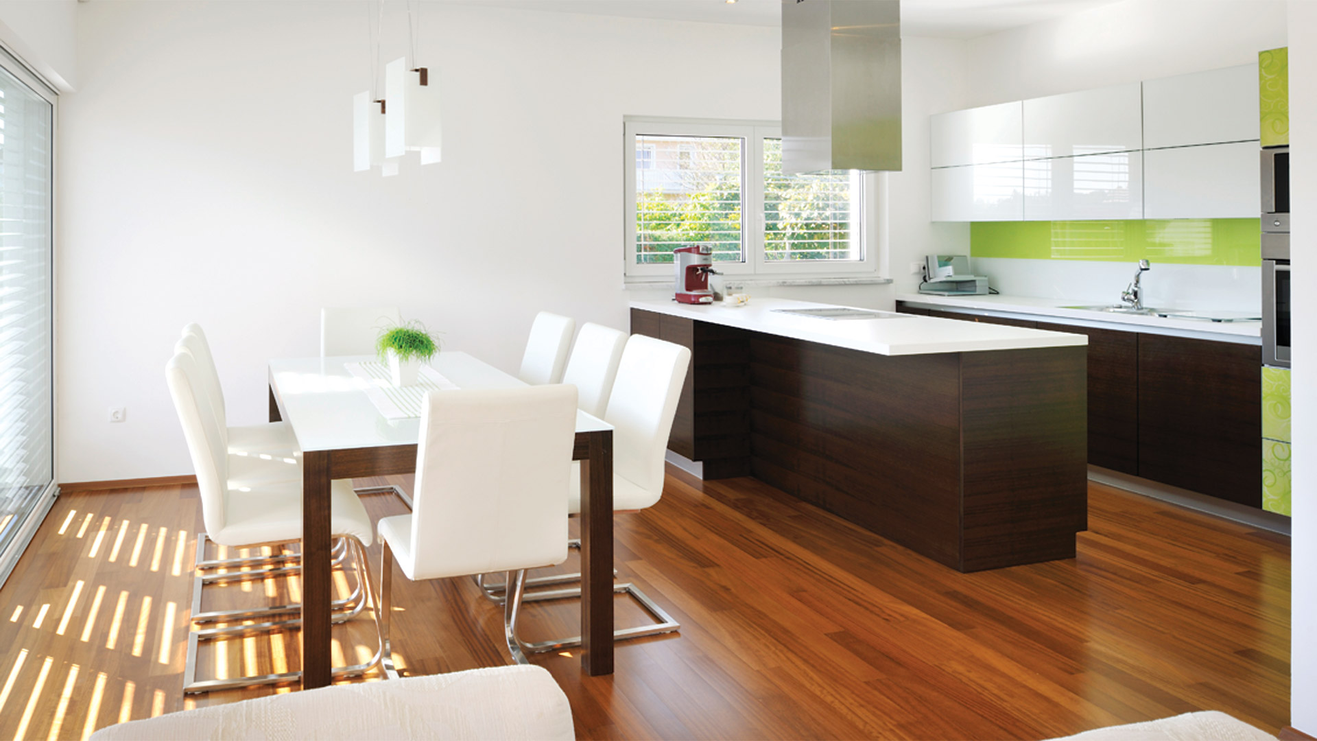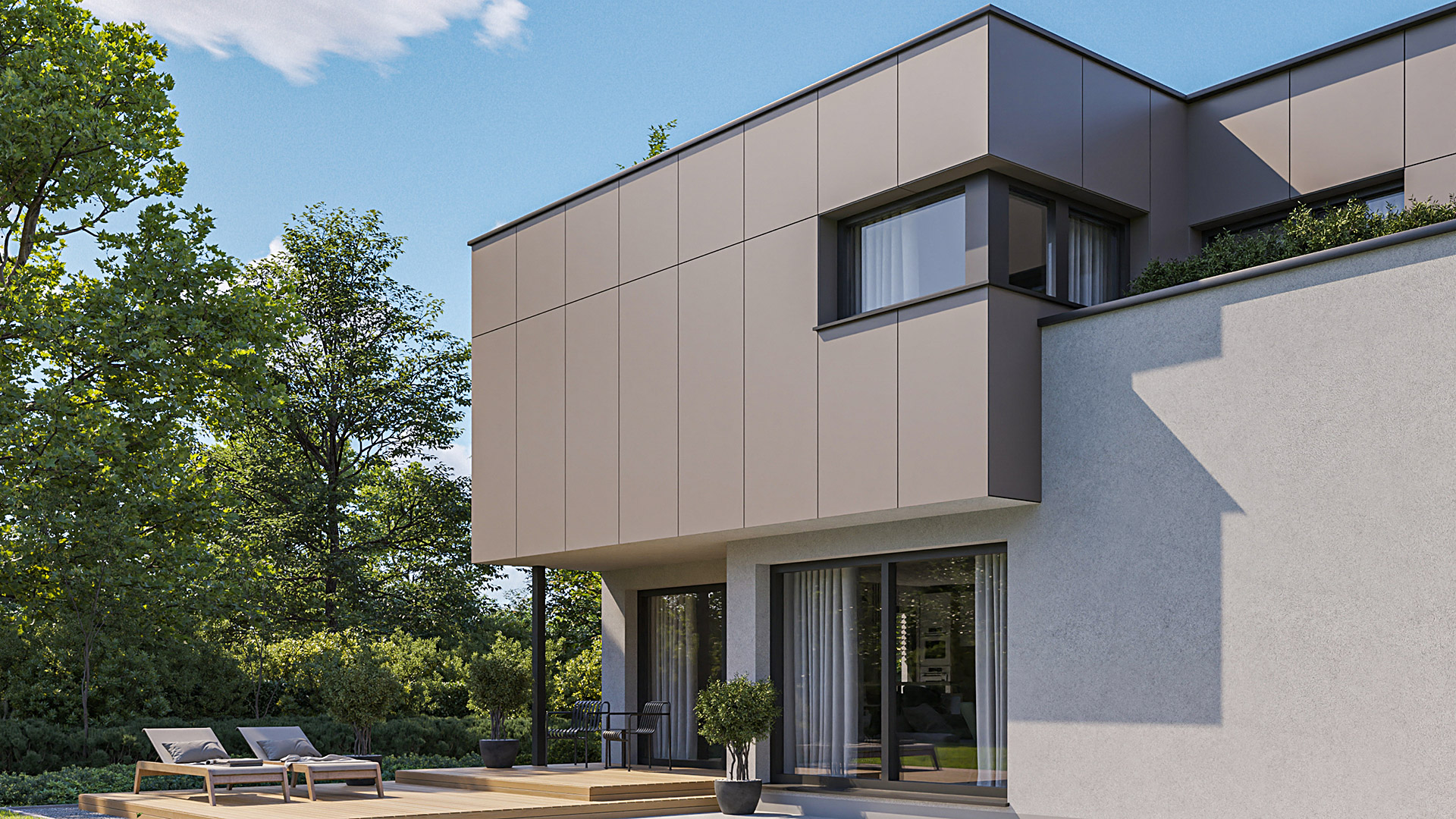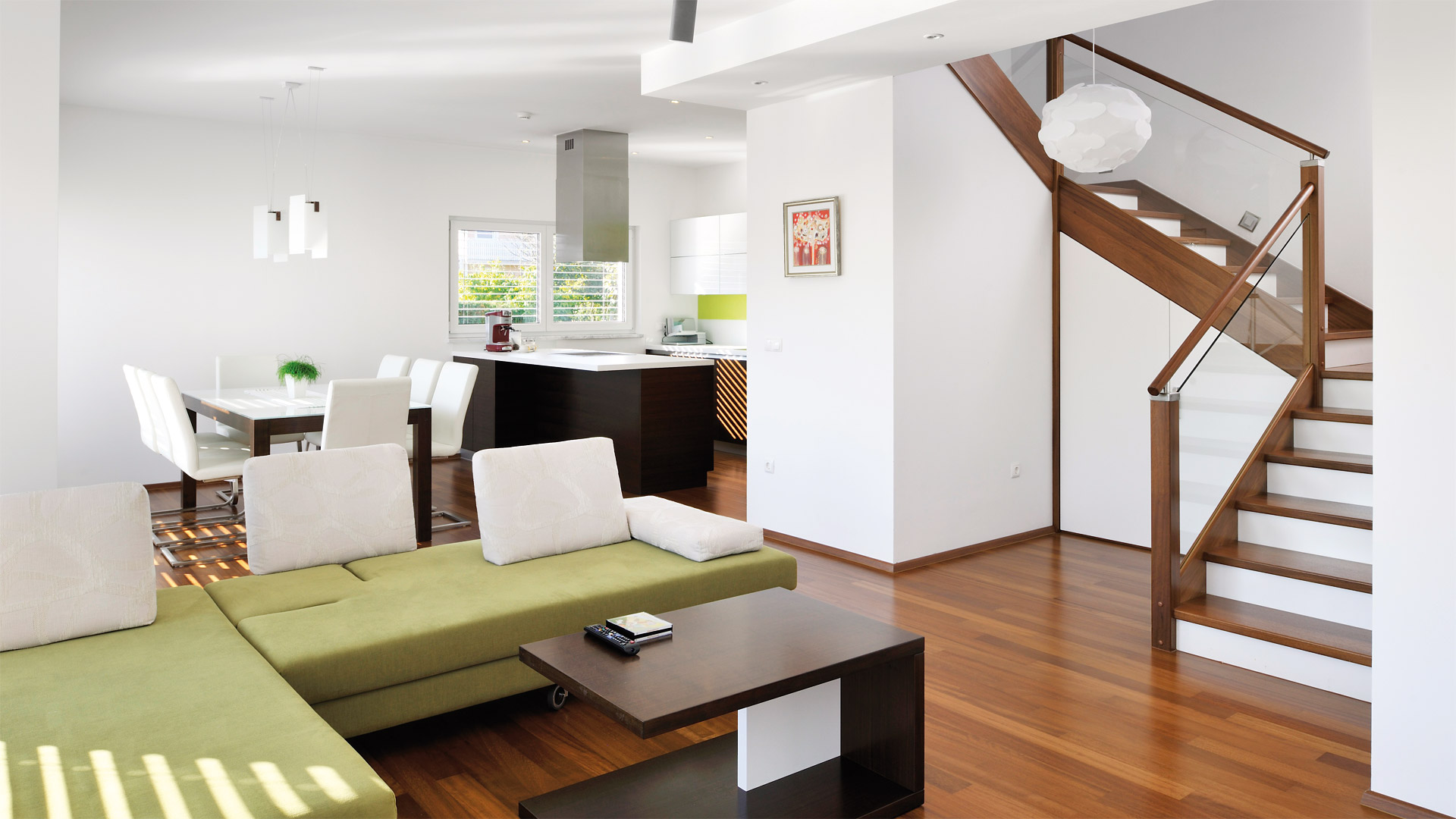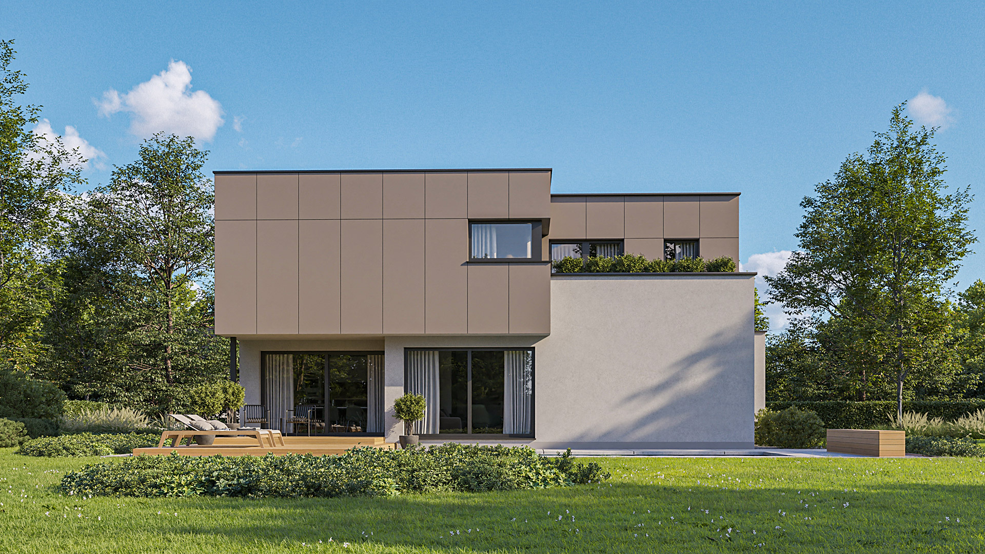 Zusätzlich zu seiner modernen Architektur besticht das Haus durch seine ausgezeichnete Energieeffizienz. Das sehr gut isolierte Flachdach reduziert den Wärmeverlust des Hauses enorm. Der Grundriss ist so konzipiert, dass sich die Räume nach Süden und Westen öffnen. Durch die großen Glasflächen wird die riesige, teilüberdachte Terrasse in den Lebensraum der Hausbewohner mitintegriert – ein wesentlicher Wohlfühlfaktor vor allem während der warmen Tage.