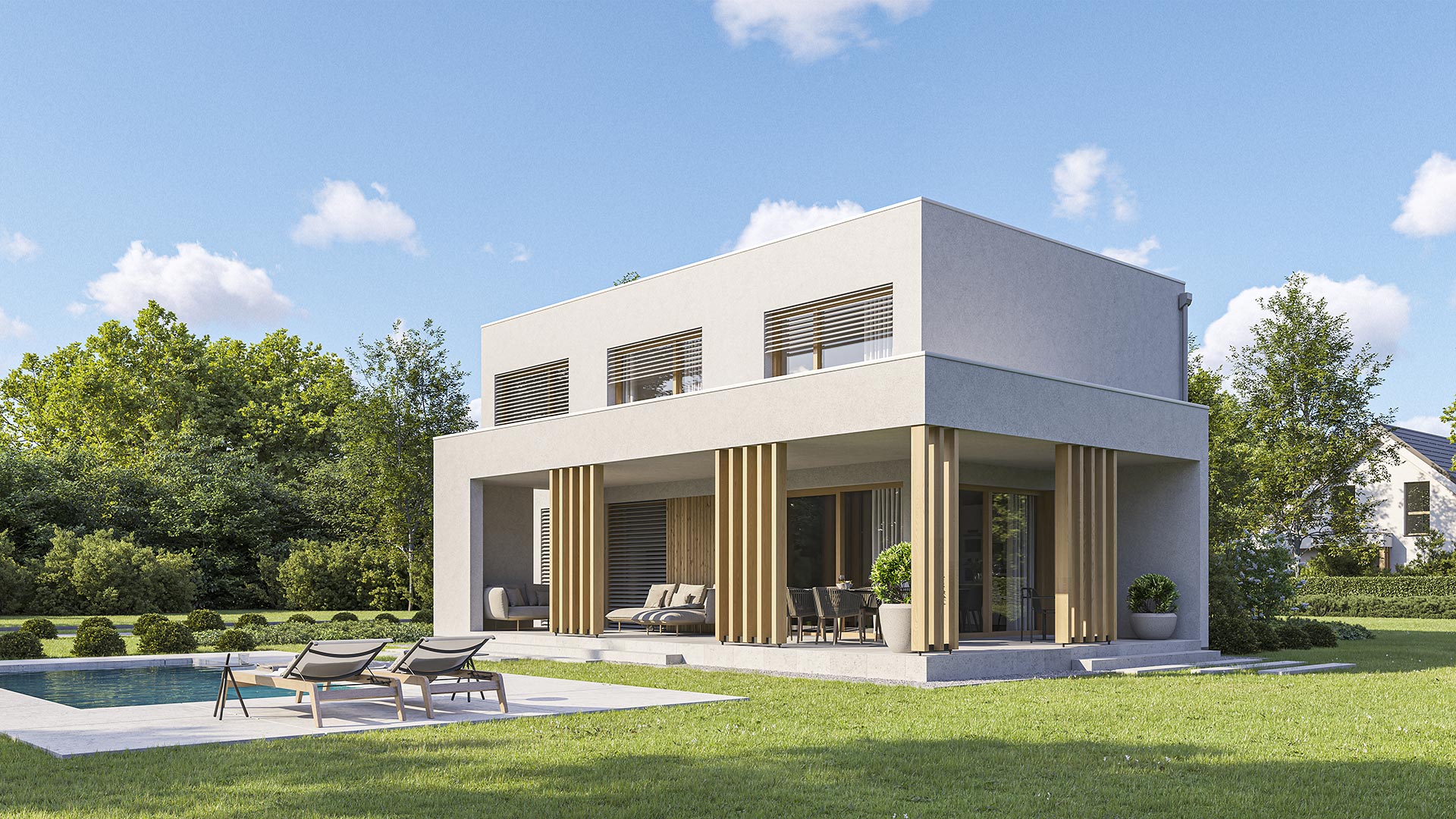 Das Flachdach versetzt das Primus in den modernen Bauhausstil und gewährleistet volle Raumnutzung im Obergeschoss ohne Dachschrägen. Ein ganz besonderes Highlight bietet die Option der Holzschalung.
