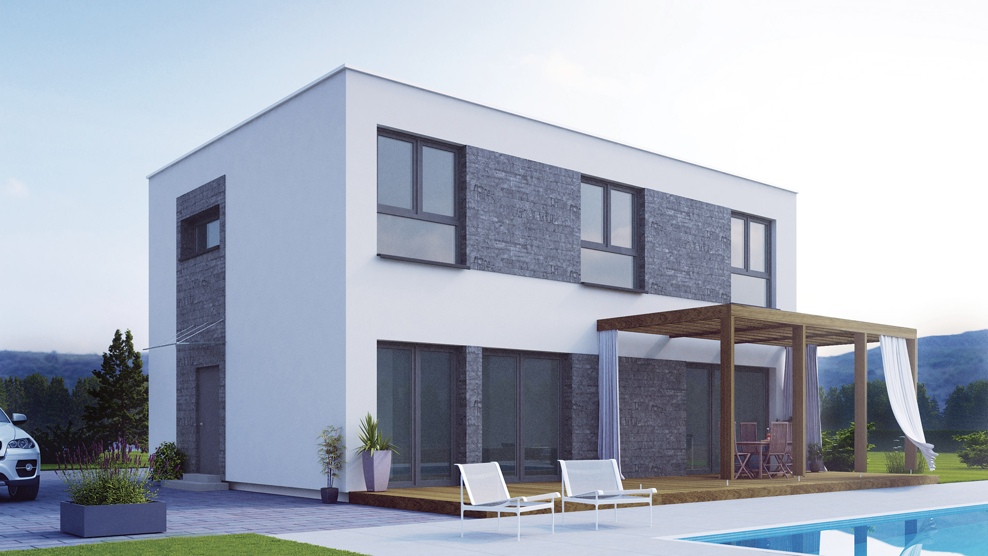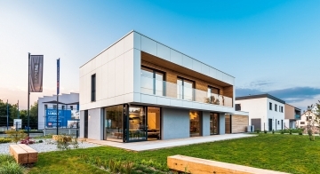 Das Flachdach versetzt das Primus in den modernen Bauhausstil und gewährleistet volle Raumnutzung im Obergeschoss ohne Dachschrägen. Ein ganz besonderes Highlight bietet die Option der Holzschalung.