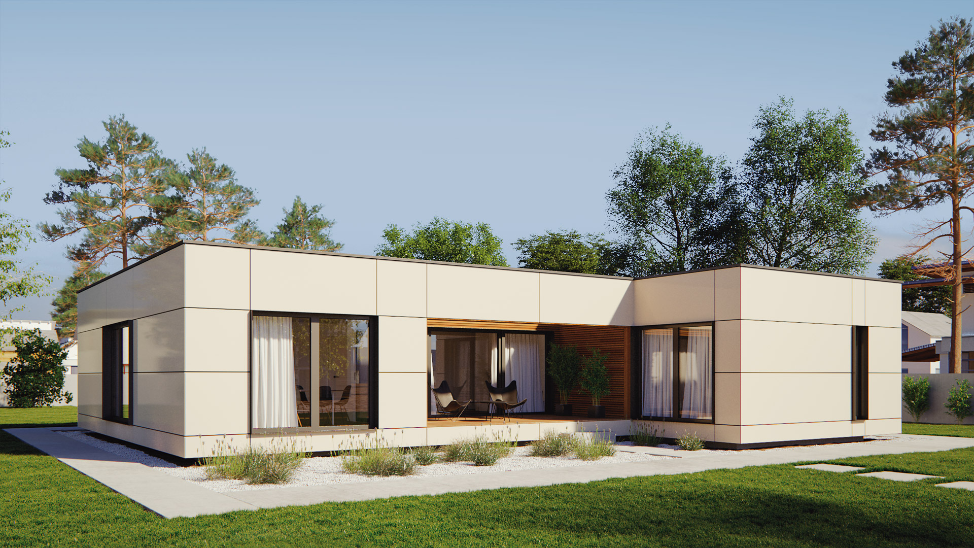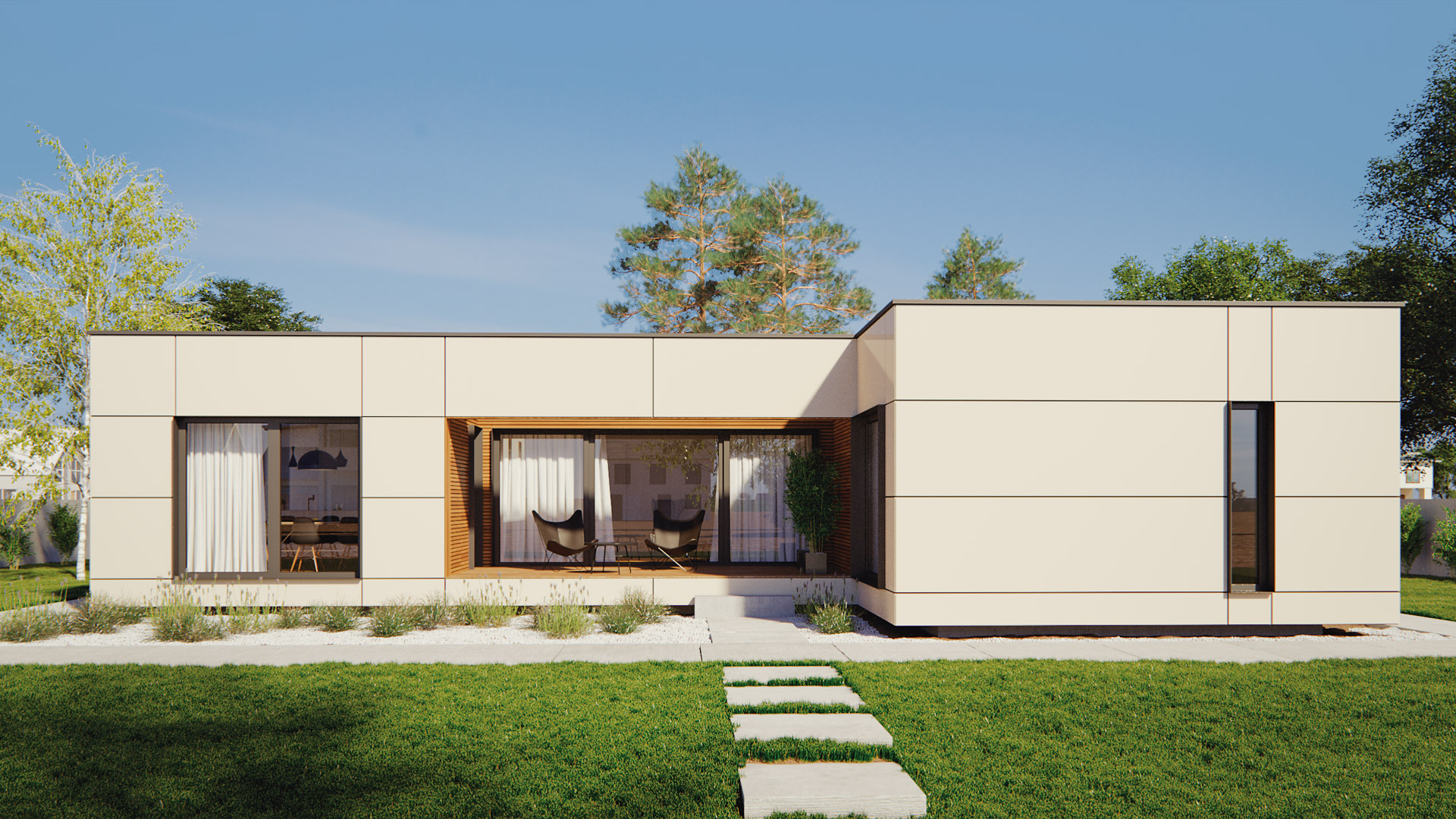 Das Haus Terra 143 ist ein Bungalow, der sich vor allem durch den zentralen Wohnbereich und der riesigen Terrasse auszeichnet. Der L-förmige Wohn-Essbereich mit integrierter Küche ist sehr offen und hell gestaltet. Sowohl das Elternschlafzimmer als auch die beiden Kinderzimmern sind jeweils mit einem eigenen Bad ausgestattet. Ein zusätzliches Zimmer direkt beim Eingangsbereich ermöglicht die Nutzung als Büro oder Gästezimmer. Das Haus ist entweder mit Flach- oder Pultdach, aber auch mit Walmdach erhältlich.