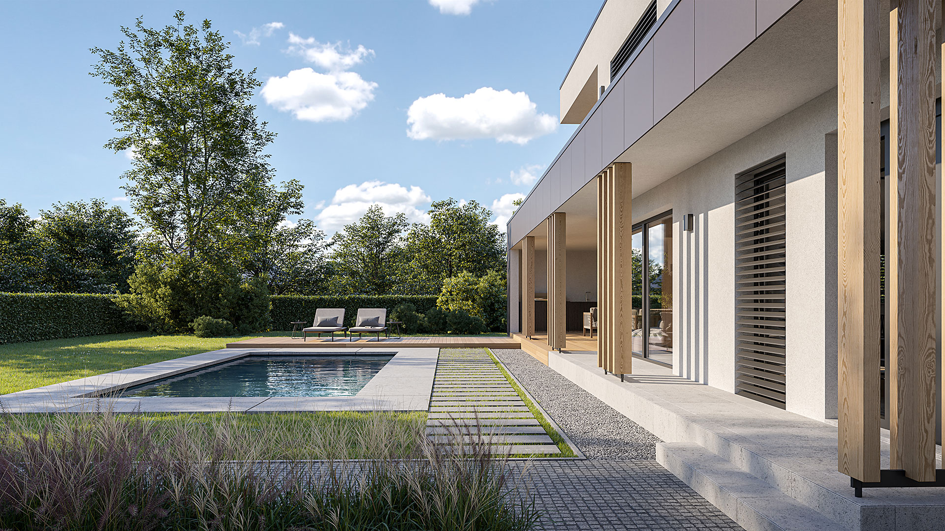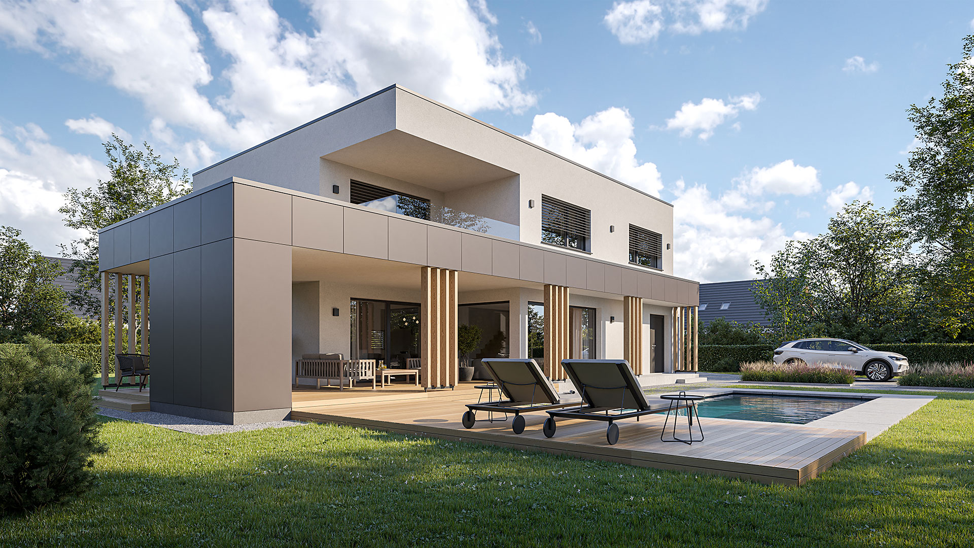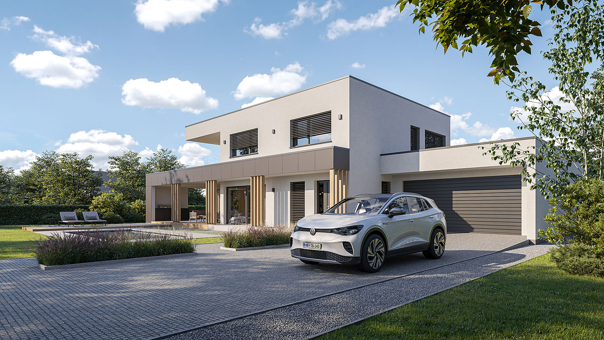 Der verspielte Grundriss mit akzentuierter Südausrichtung verfügt über 200 Quadratmeter Wohnfläche. Die 48 Quadratmeter überdachte Terrasse sorgt für zusätzlichen Komfort und bietet Zugang zum großzügigen Erdgeschoss. Die hellen Wohnräume sind mit der überdachten Terrasse verbunden, die im Sommer als Wohnzimmer dienen und zu jeder Jahreszeit einen angenehmen Schutz bieten. Der Zugang zum Stockwerk erfolgt über eine offene, gerade Treppe, die an ihrem Ende mit einem Panoramafenster mit Blick auf die Landschaft endet. Geräumige Kinderzimmer, ein gemeinsamer Aufenthaltsbereich und ein eigenes Bad bieten viel Komfort für die jüngeren Mitglieder. Die komfortable Schlafsuite bietet Zugang zu einer diskreten Außenterrasse.