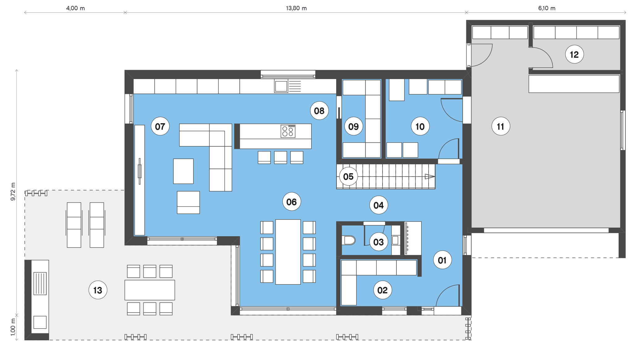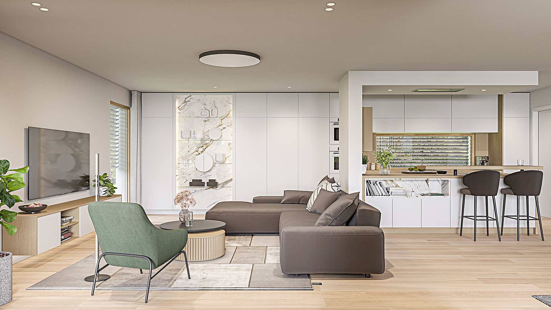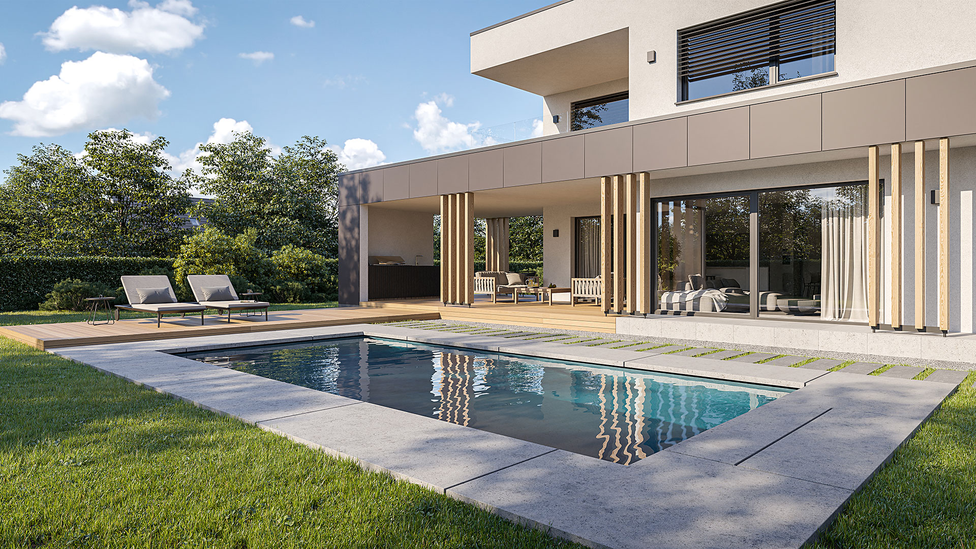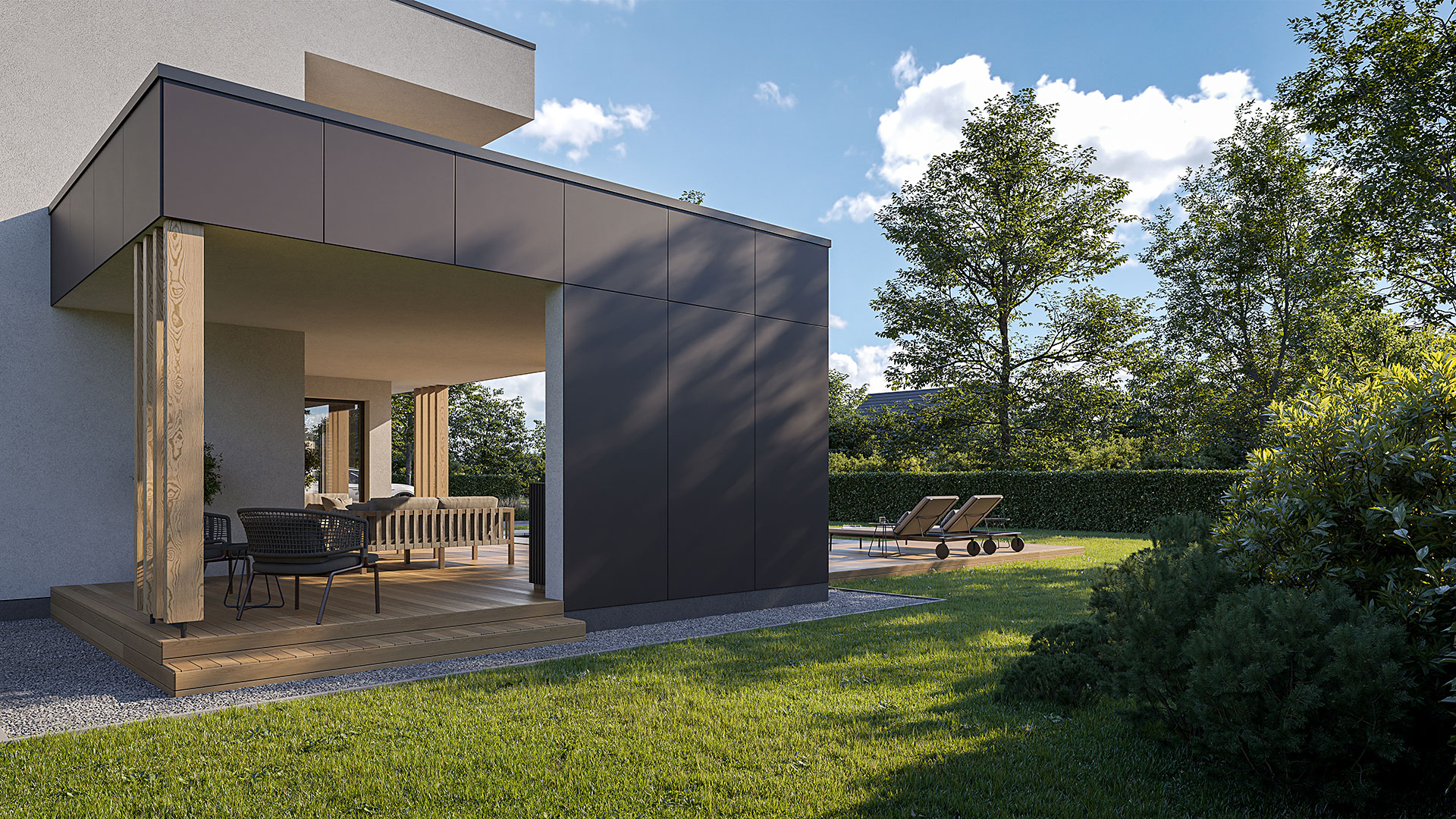 Der verspielte Grundriss mit akzentuierter Südausrichtung verfügt über 200 Quadratmeter Wohnfläche. Die 48 Quadratmeter überdachte Terrasse sorgt für zusätzlichen Komfort und bietet Zugang zum großzügigen Erdgeschoss. Die hellen Wohnräume sind mit der überdachten Terrasse verbunden, die im Sommer als Wohnzimmer dienen und zu jeder Jahreszeit einen angenehmen Schutz bieten. Der Zugang zum Stockwerk erfolgt über eine offene, gerade Treppe, die an ihrem Ende mit einem Panoramafenster mit Blick auf die Landschaft endet. Geräumige Kinderzimmer, ein gemeinsamer Aufenthaltsbereich und ein eigenes Bad bieten viel Komfort für die jüngeren Mitglieder. Die komfortable Schlafsuite bietet Zugang zu einer diskreten Außenterrasse.