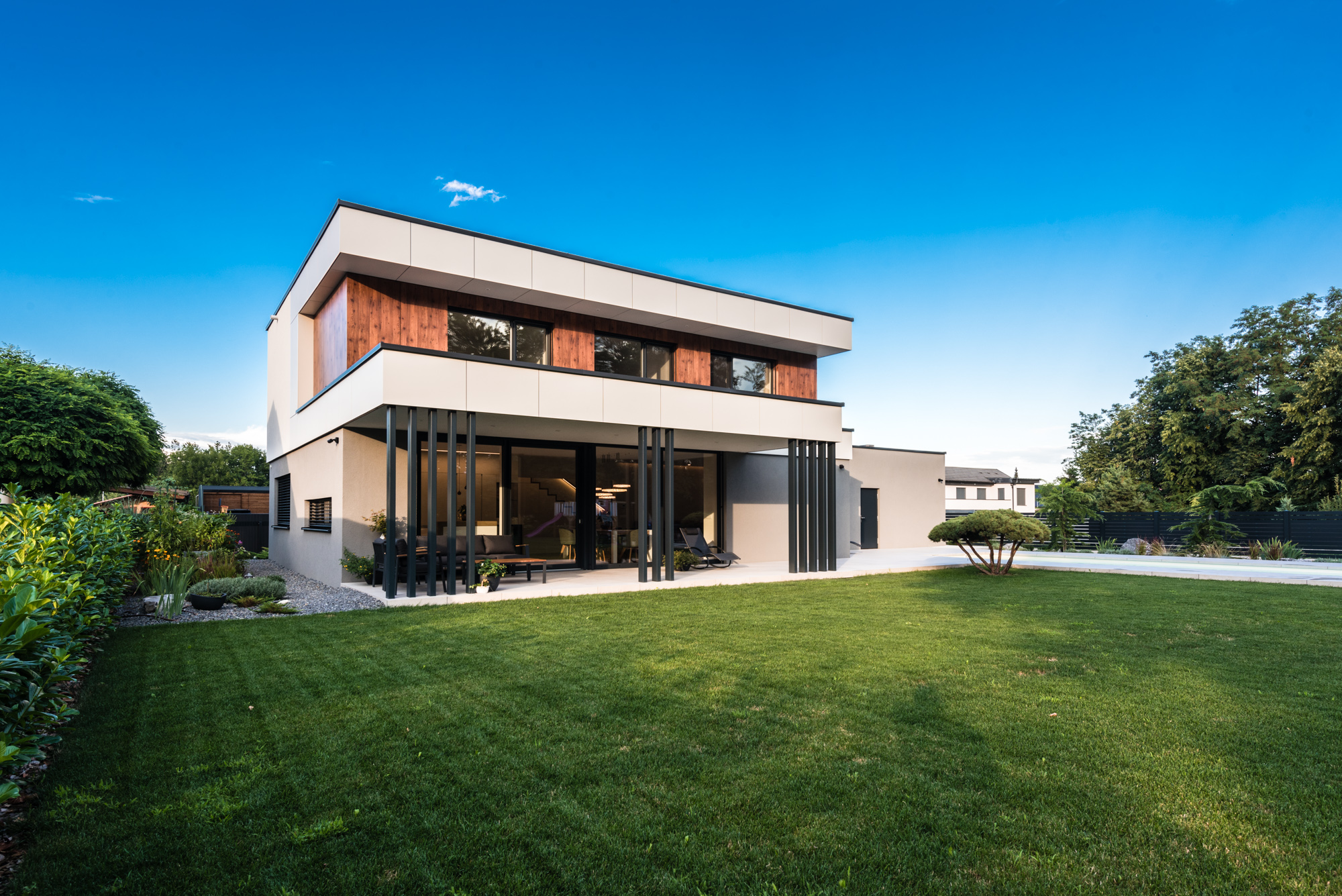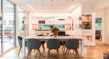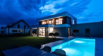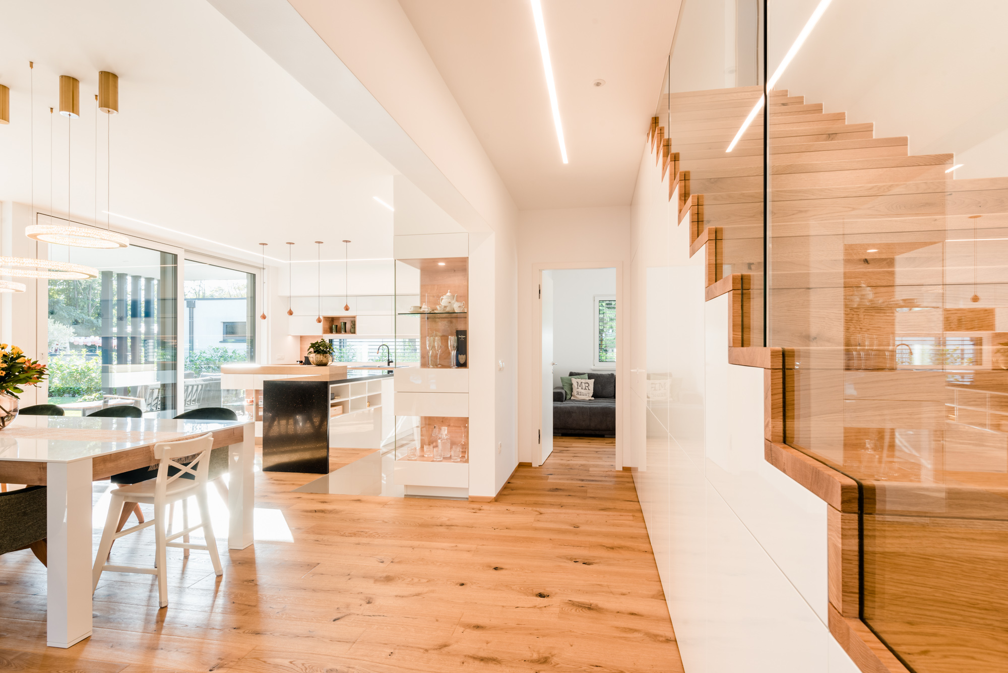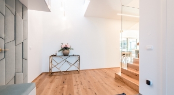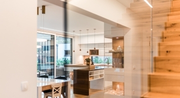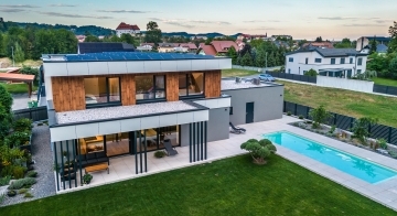Die Gestaltung des Erdgeschosses zeichnet sich durch eine Trennung der funktionalen Bereiche aus. Großzügigkeit vermittelt bereits der Eingangsbereich. Die Küche und das Esszimmer können vom Wohnzimmer getrennt werden und ermöglichen dadurch eine ruhige Rückzugsmöglichkeit. Das Obergeschoss bietet sogar einer 5-köpfigen Familie eine gemütliche und durchdachte Raumaufteilung. Ein eigener Elternbereich besticht durch Schlafzimmer mit begehbarem Schrankraum und einem großzügigen Bad. Ein weiteres Bad ist den 3 Kinderziemmern zugeteilt. Eine Dachterrasse erweitert im Sommer den Lebensraum im Obergeschoss.