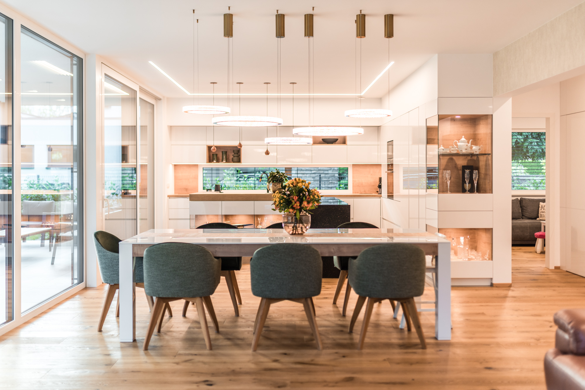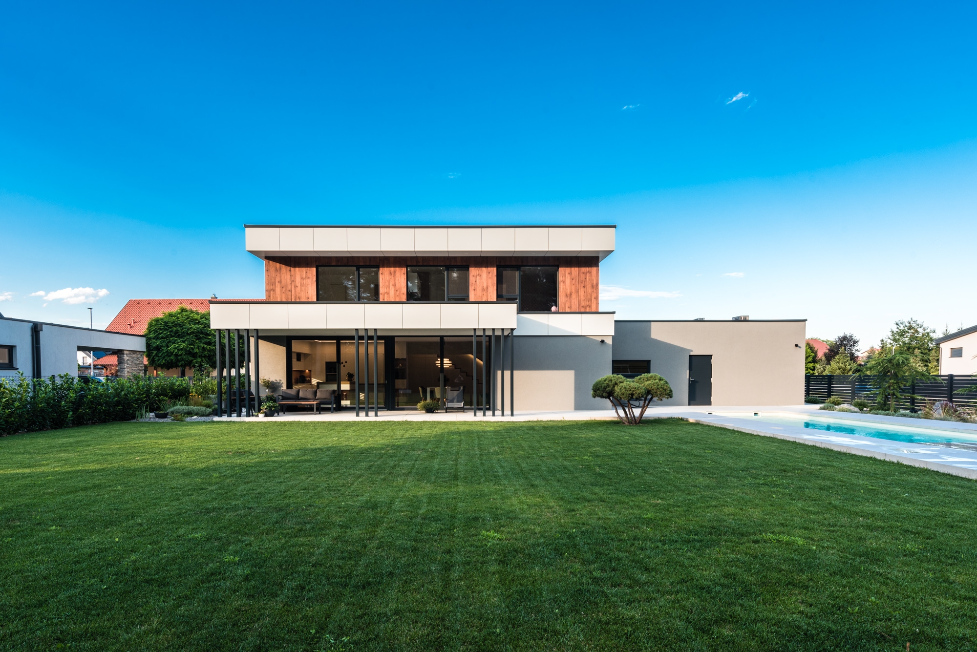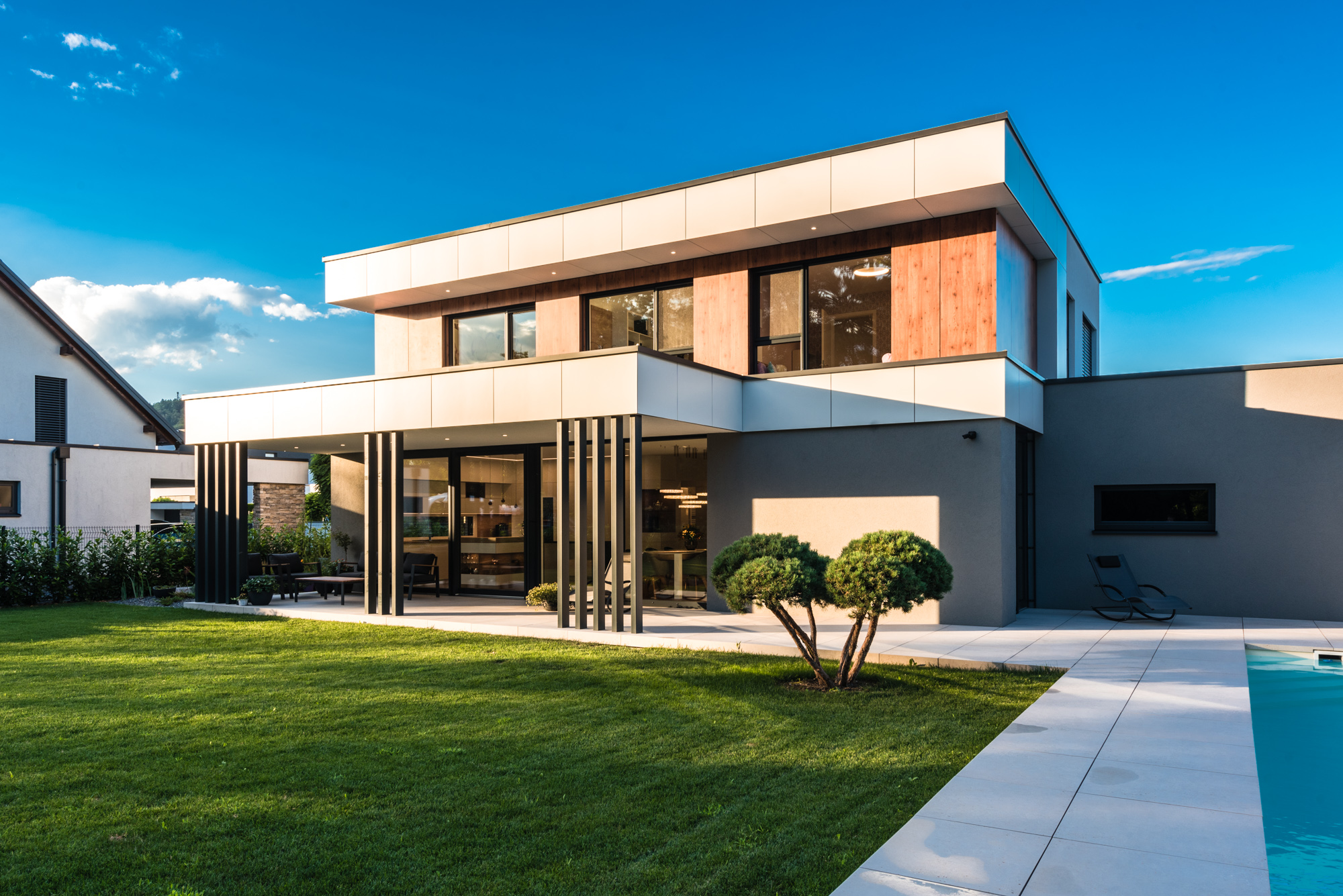 Die Gestaltung des Erdgeschosses zeichnet sich durch eine Trennung der funktionalen Bereiche aus. Großzügigkeit vermittelt bereits der Eingangsbereich. Die Küche und das Esszimmer können vom Wohnzimmer getrennt werden und ermöglichen dadurch eine ruhige Rückzugsmöglichkeit. Das Obergeschoss bietet sogar einer 5-köpfigen Familie eine gemütliche und durchdachte Raumaufteilung. Ein eigener Elternbereich besticht durch Schlafzimmer mit begehbarem Schrankraum und einem großzügigen Bad. Ein weiteres Bad ist den 3 Kinderziemmern zugeteilt. Eine Dachterrasse erweitert im Sommer den Lebensraum im Obergeschoss.
