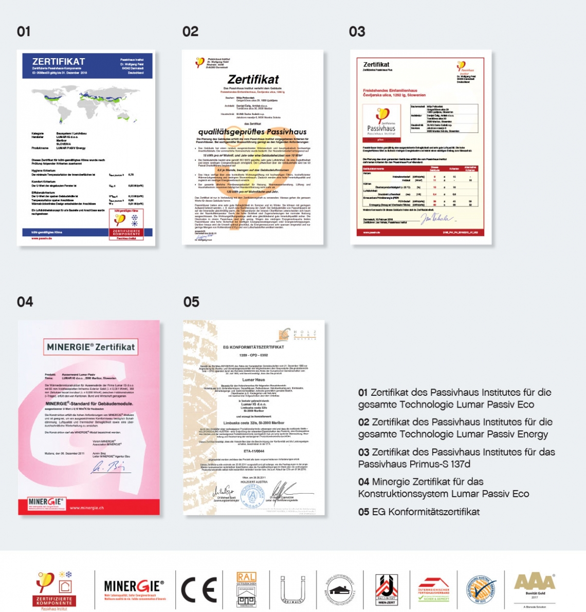 Die Kontrollen seitens der bevollmächtigten Institution werden zweimal jährlich durchgeführt. Das erfolgreich vergebene Zertifikat ist die Basis dafür gewesen, unsere Konstruktionen auch mit dem CE-Kennzeichen ausweisen zu können. Grundlage für den deutschen und österreichischen Markt bilden das Österreichische ÜA-Zeichen und das Deutsche U-Zeichen. Mit der Entwicklung der Konstruktionssysteme für den Bau von Niedrigenergie- und Passivhäusern wurden unsere Konstruktionen auch beim deutschen Passivhausinstitut und dem schweizerischen Institut Minergie zertifiziert. Als erster Anbieter von Fertighäusern in Slowenien haben wir unsere komplette Technologie beim Passivhaus-Institut in Deutschland zertifizieren lassen, später ist beim selben Institut noch das erste slowenische Passiv-Plus-Energie Haus, welches wir mit Mitja Petkovšek gebaut haben, zertifiziert worden.