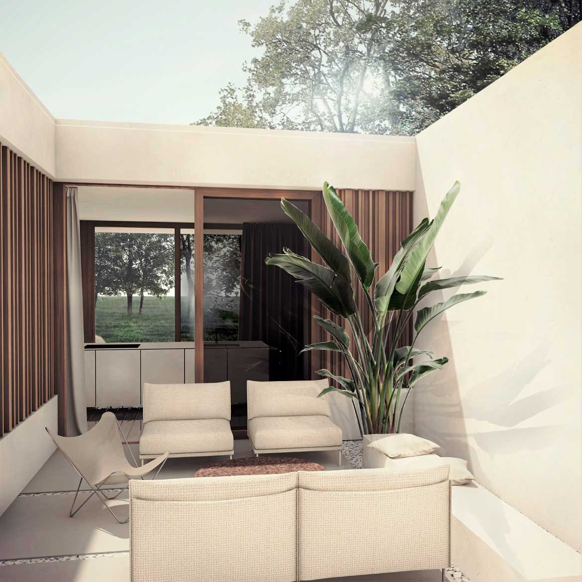 Mit direktem Zugang von Vorraum, Wohnraum und Schlafzimmer bietet der Innenhof die Möglichkeit, die Zeit draußen, jedoch geschützt vor fremden Blicken, zu genießen.