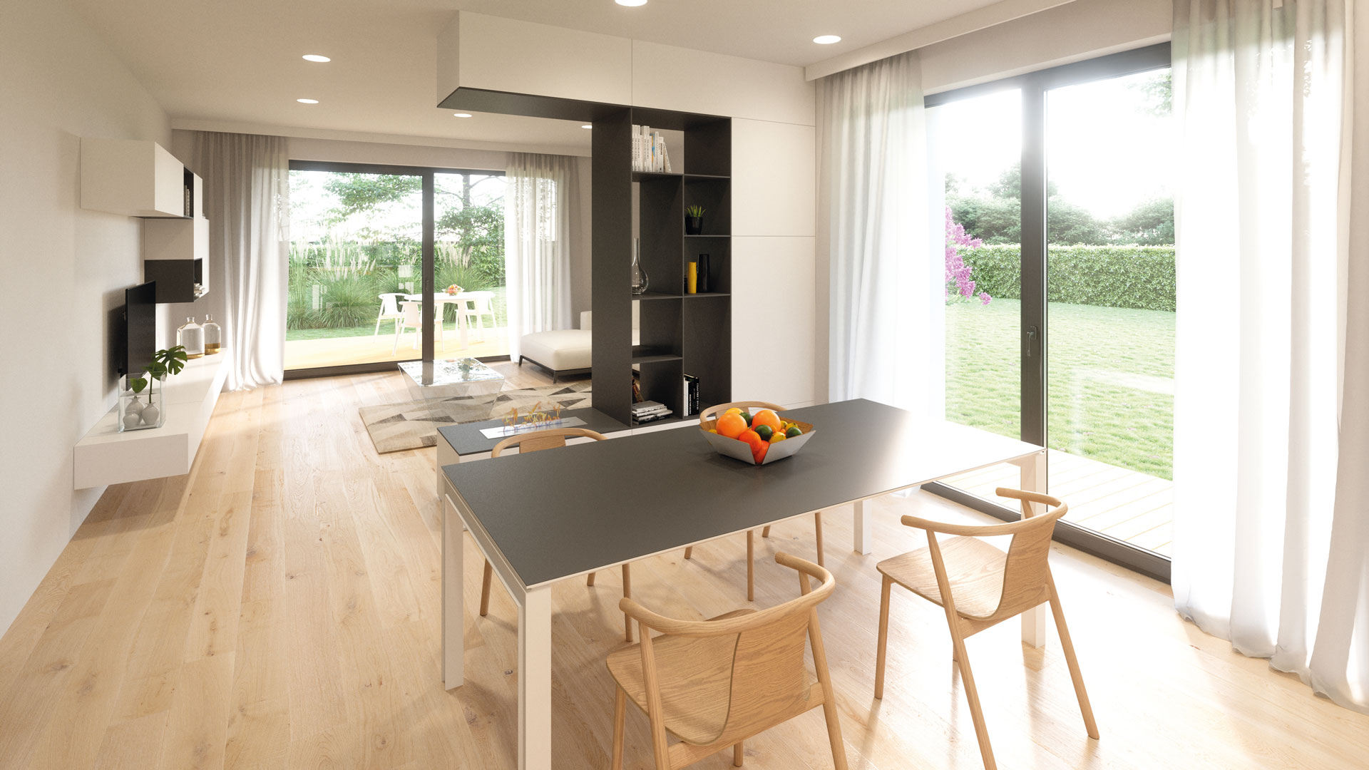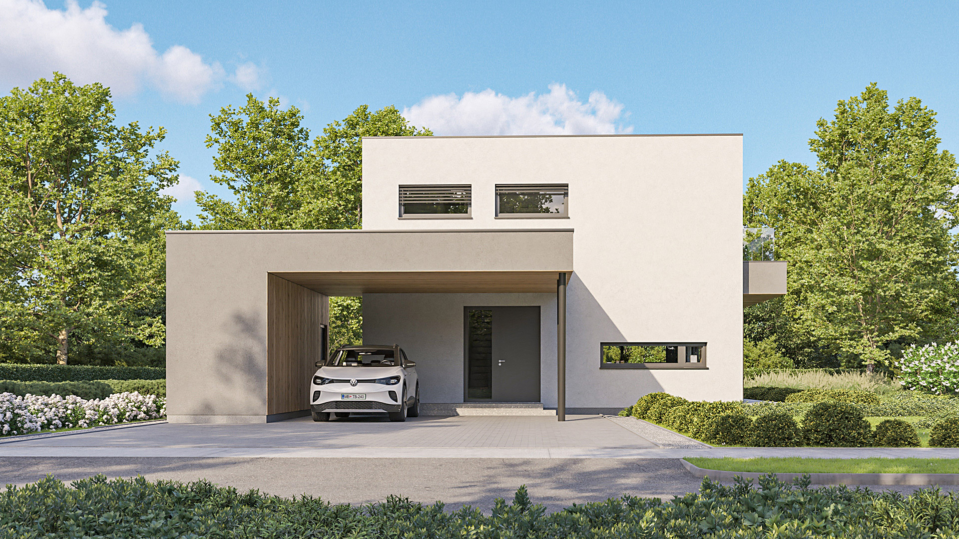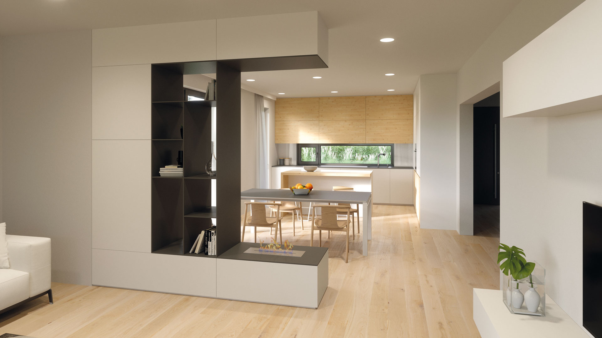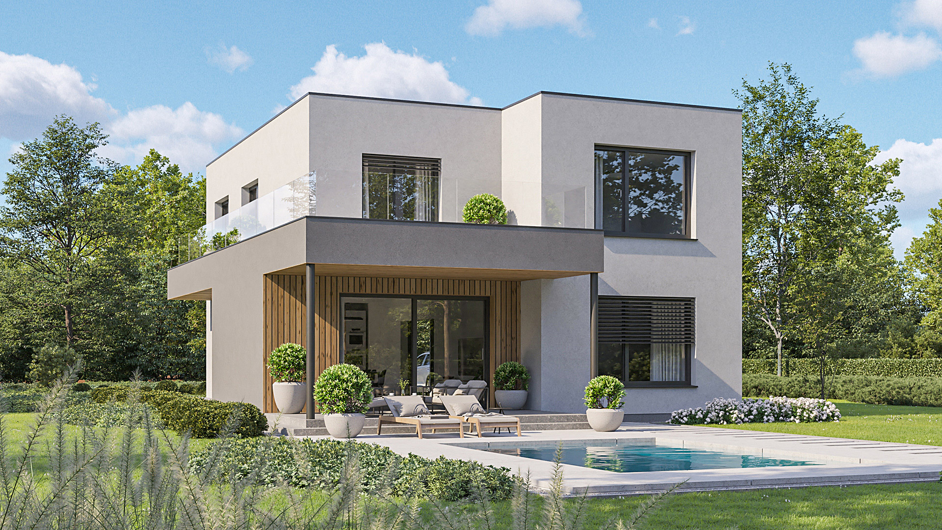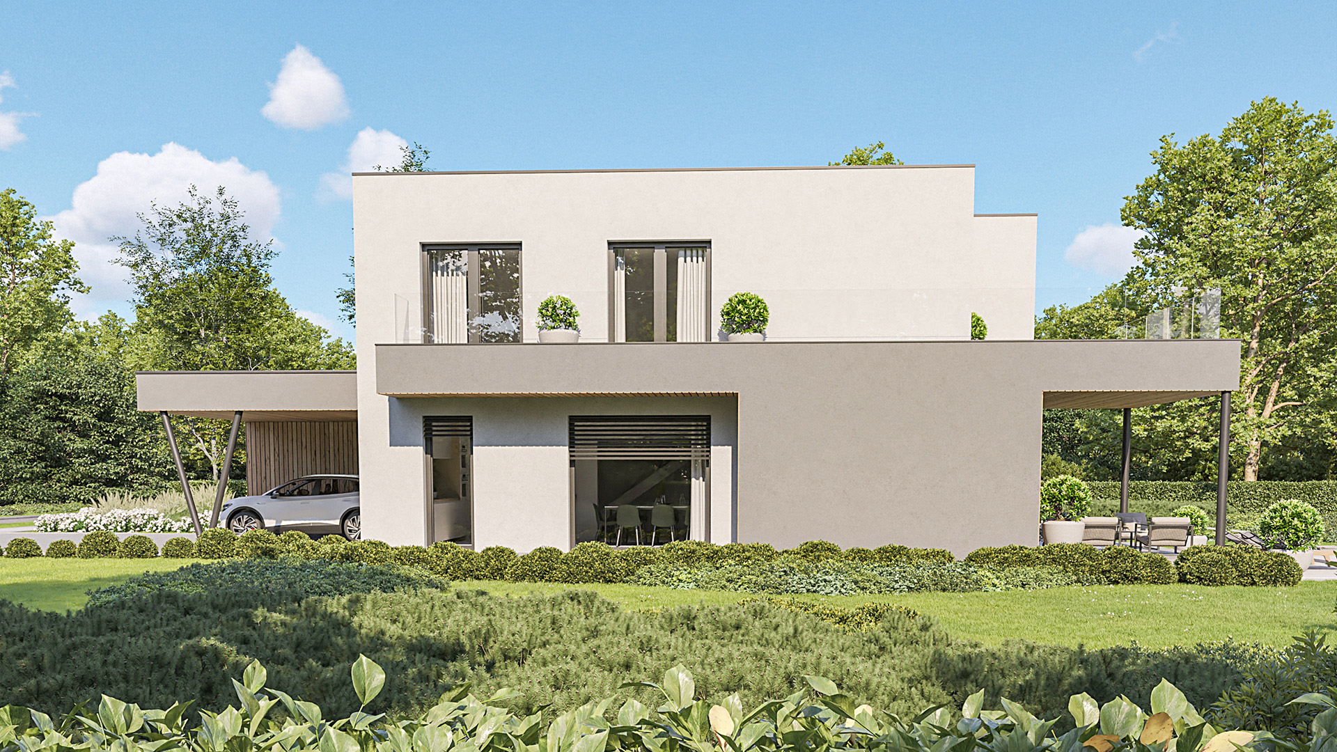 Die Gestaltung des Erdgeschosses zeichnet sich durch eine Trennung der funktionalen Bereiche aus. Großzügigkeit vermittelt bereits der Eingangsbereich. Die Küche und das Esszimmer können vom Wohnzimmer getrennt werden und ermöglichen dadurch eine ruhige Rückzugsmöglichkeit. Das Obergeschoss bietet sogar einer 5-köpfigen Familie eine gemütliche und durchdachte Raumaufteilung. Ein eigener Elternbereich besticht durch Schlafzimmer mit begehbarem Schrankraum und einem großzügigen Bad. Ein weiteres Bad ist den 3 Kinderziemmern zugeteilt. Eine Dachterrasse erweitert im Sommer den Lebensraum im Obergeschoss.