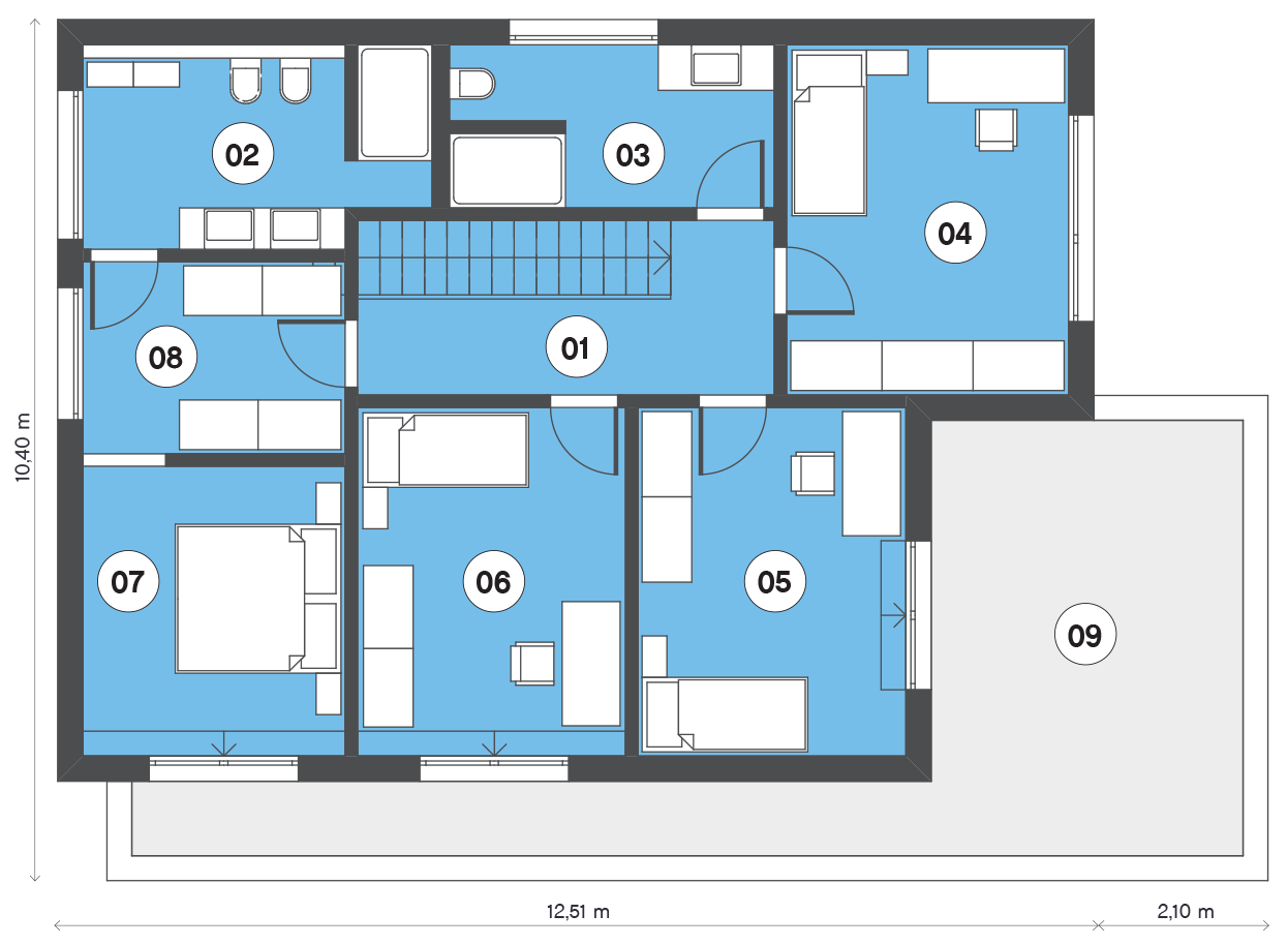 | 05 | Flur mit der Treppe | 12,66 m2 |