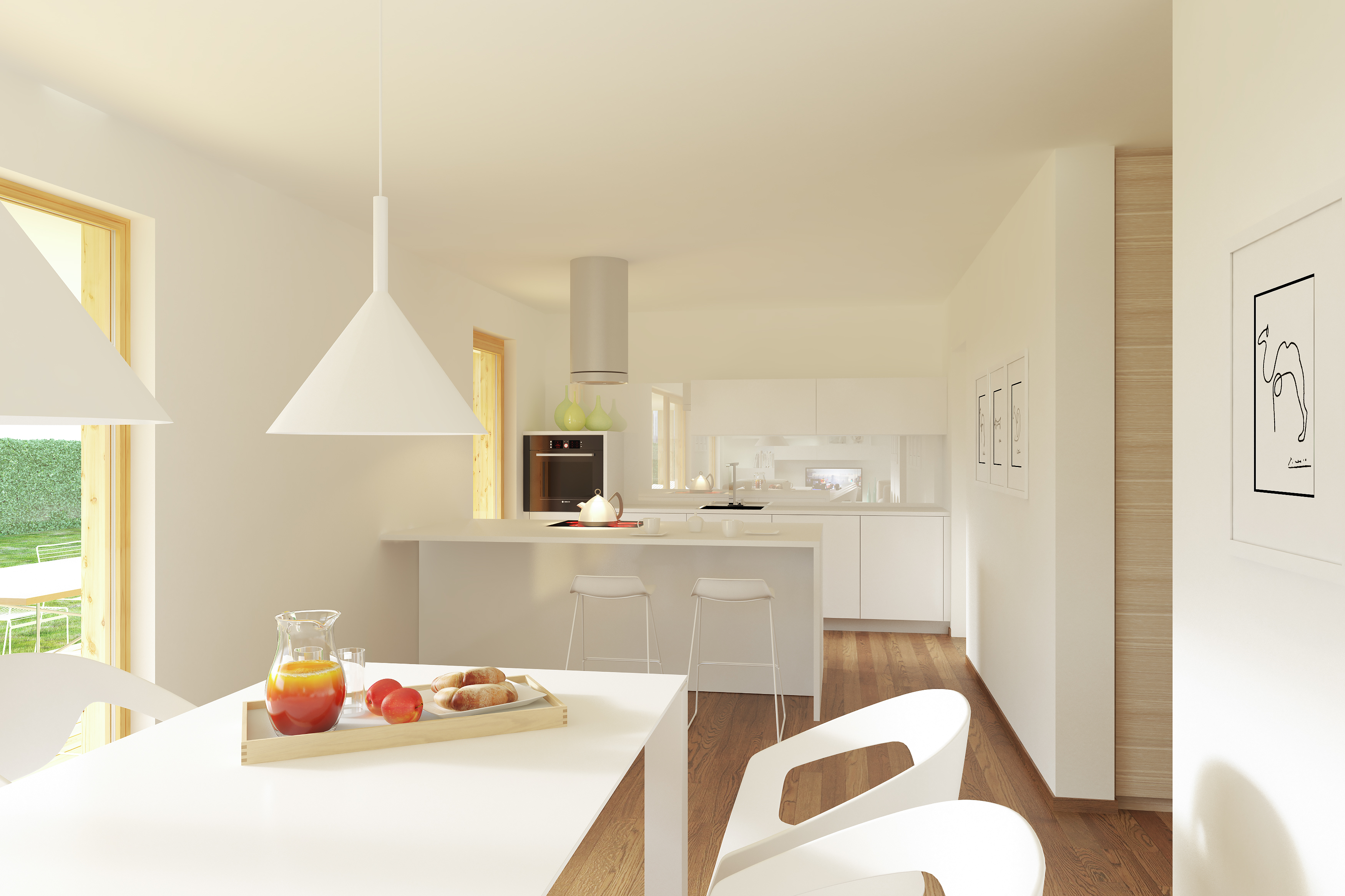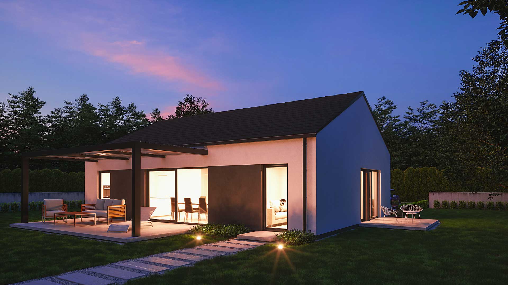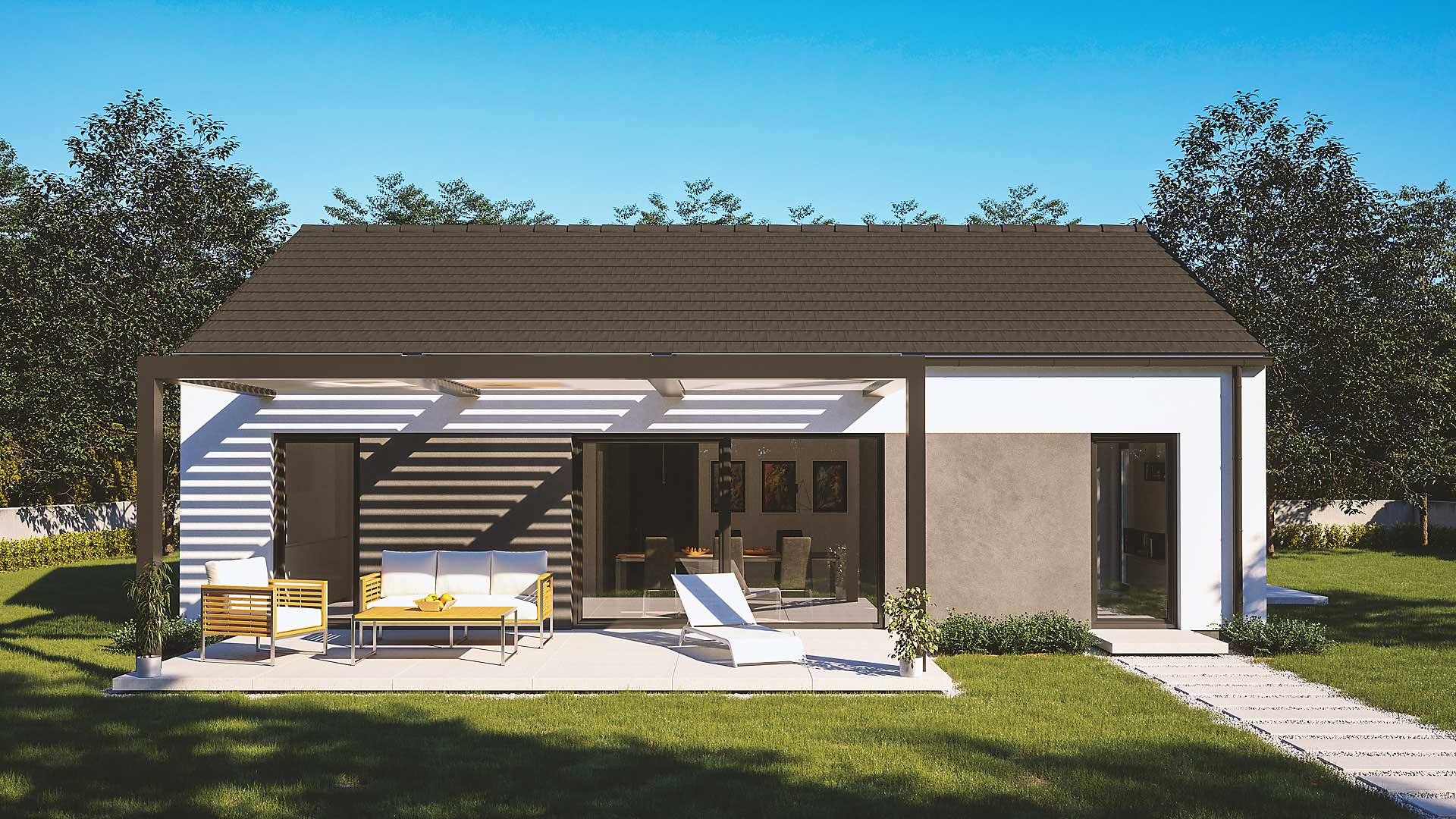 Das Haus ist wie geschaffen für Familien und alle, die ihr Zuhause und die Sonne gern den ganzen Tag genießen. Das ebenerdige, langgestreckte Haus ist so konzipiert, dass es bei südseitiger Ausrichtung die Sonneneinstrahlung bestmöglich ausnutzt. Auf diese Weise sind alle Wohnräume, einschließlich der beiden Kinderzimmer, – je nach Jahreszeit – vom frühen Vormittag bis zum späten Nachmittag ausgiebig lichtdurchflutet.