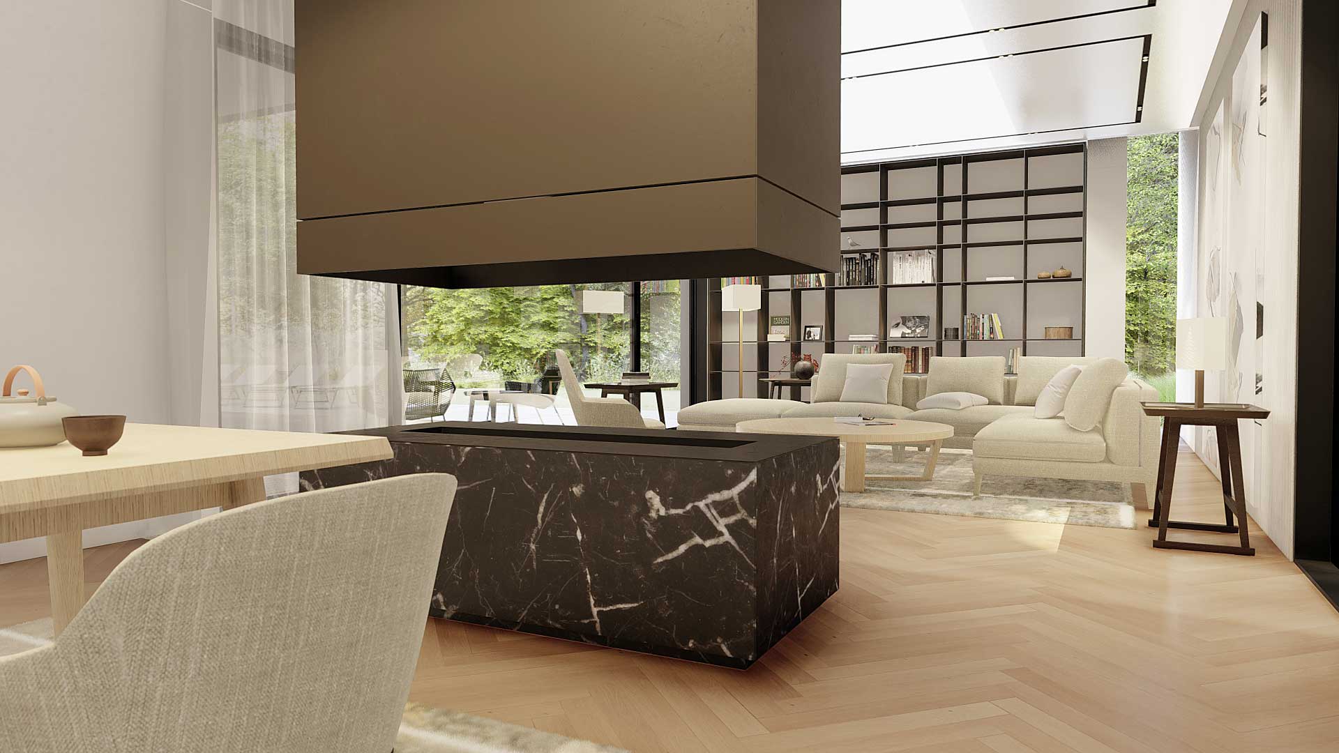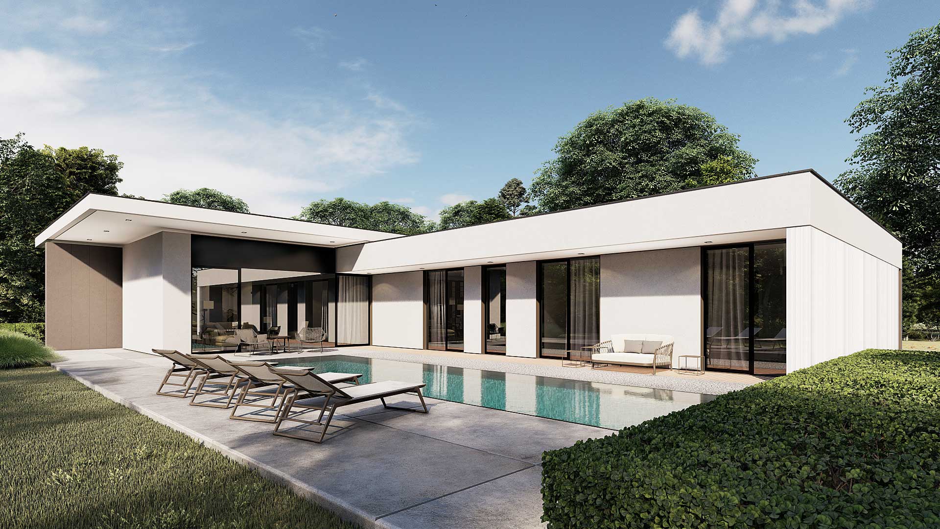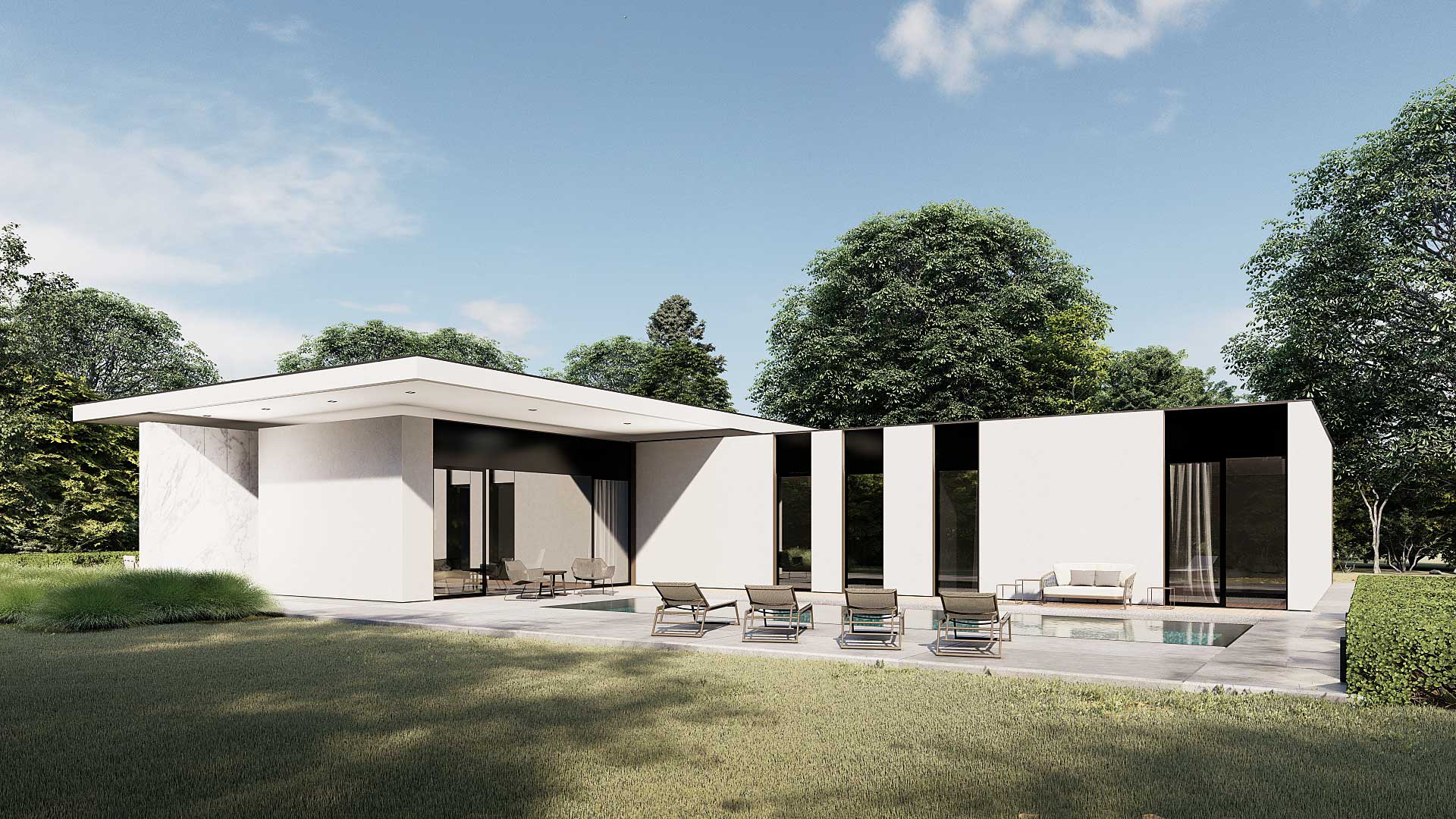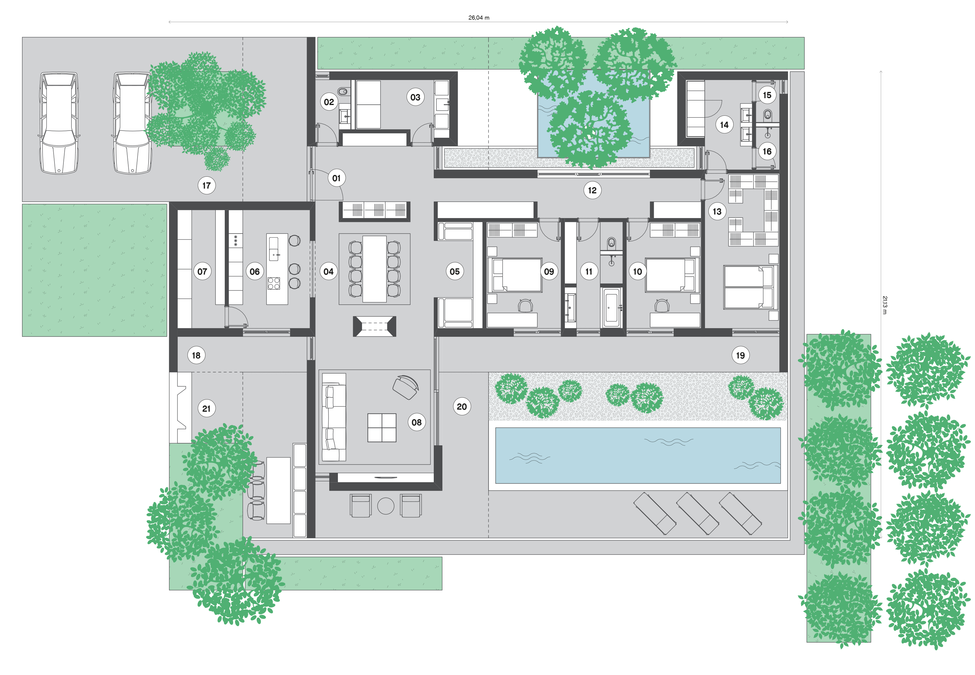 Der rechteckige Entwurf orientiert sich zum den Garten. Der Eingangsbereich gibt die Raumstruktur vor. Der Wohnraum erstreckt sich weiter nach Süden und bietet den Blick in den Garten. Die Schlafräume verlaufen rechtwinklig nach Osten und sind auch auf die südliche Gartenlandschaft ausgerichtet. Der große zentrale Raum mit einer tiefen Nische bietet verschiedene Möglichkeiten, um sich zu unterhalten und Freizeit zu verbringen. Die Küche ist direkt mit der Terrasse und dem Kräutergarten verbunden. Eine zusätzliche Qualität aller Wohnräume sind die überdachten Terrassen, die einen Zwischenraum zwischen Innenraum und Natur darstellen. Die Gestaltung der Umgebung schafft zusammen mit dem Gebäude eine Harmonie mit unterschiedlichem Ambiente.