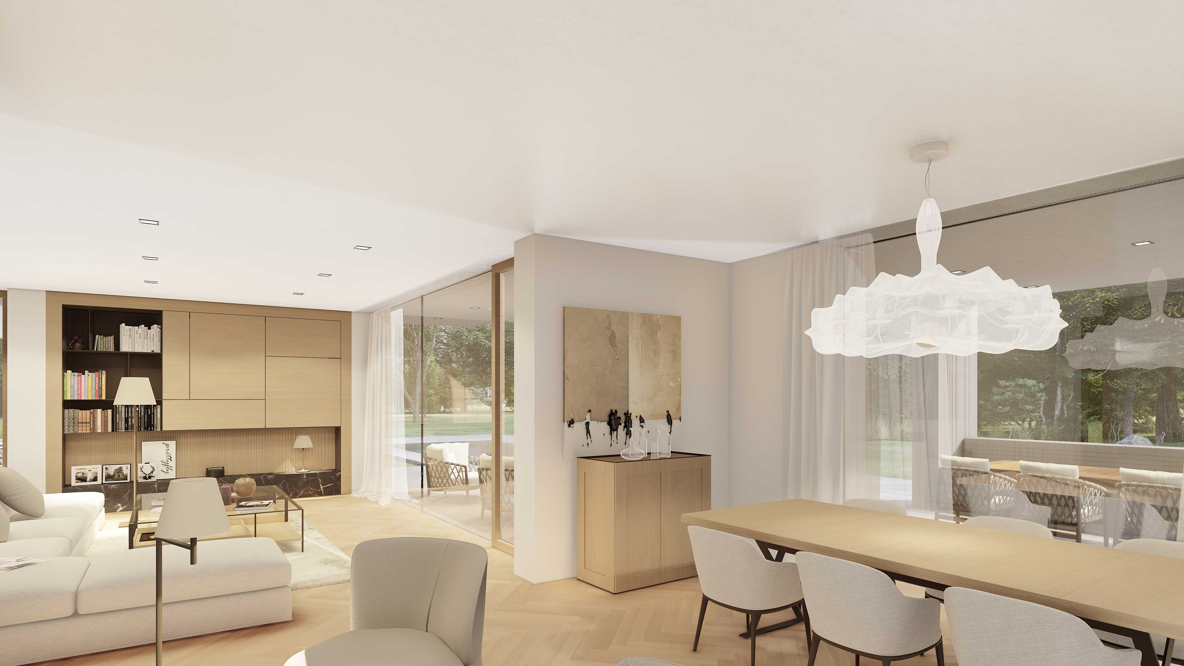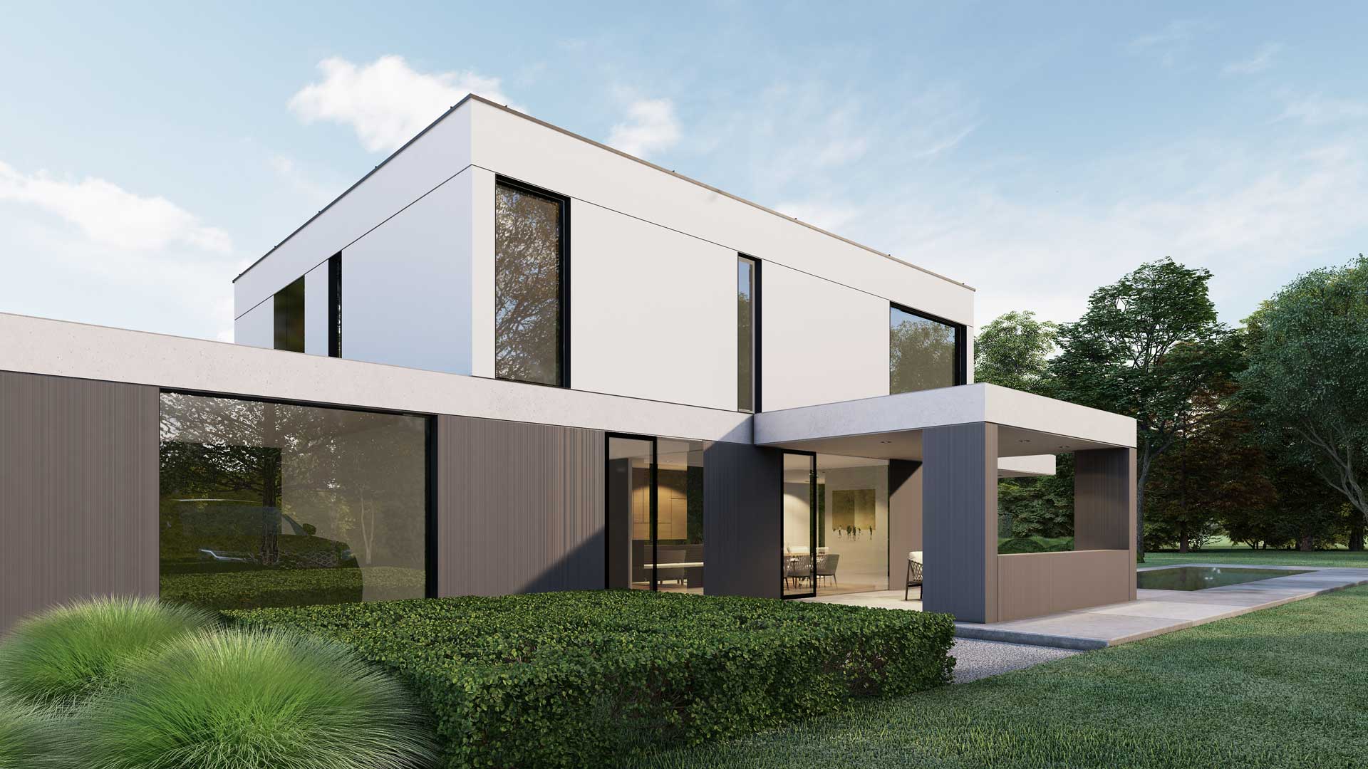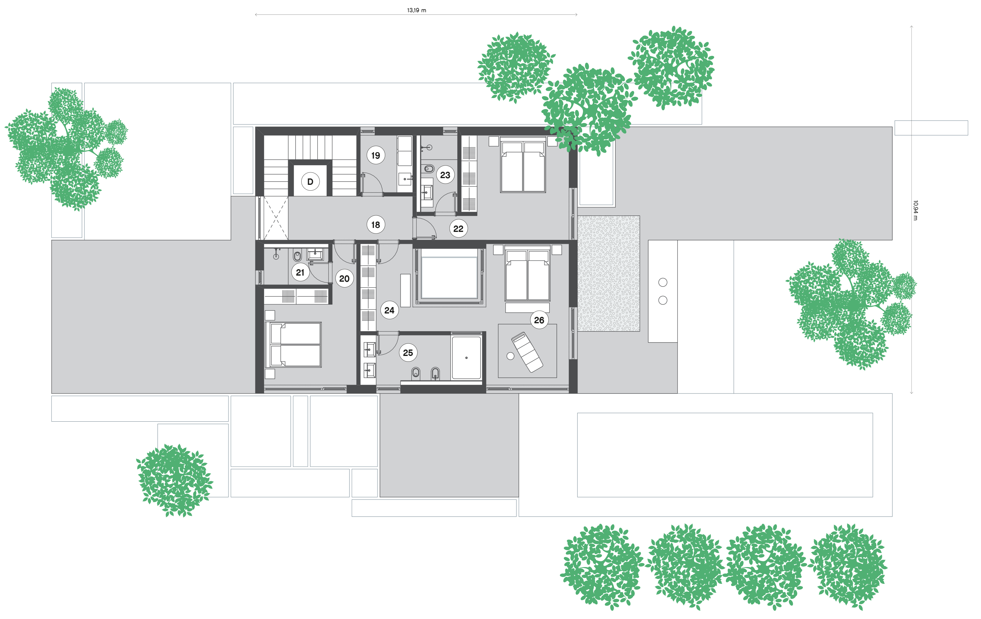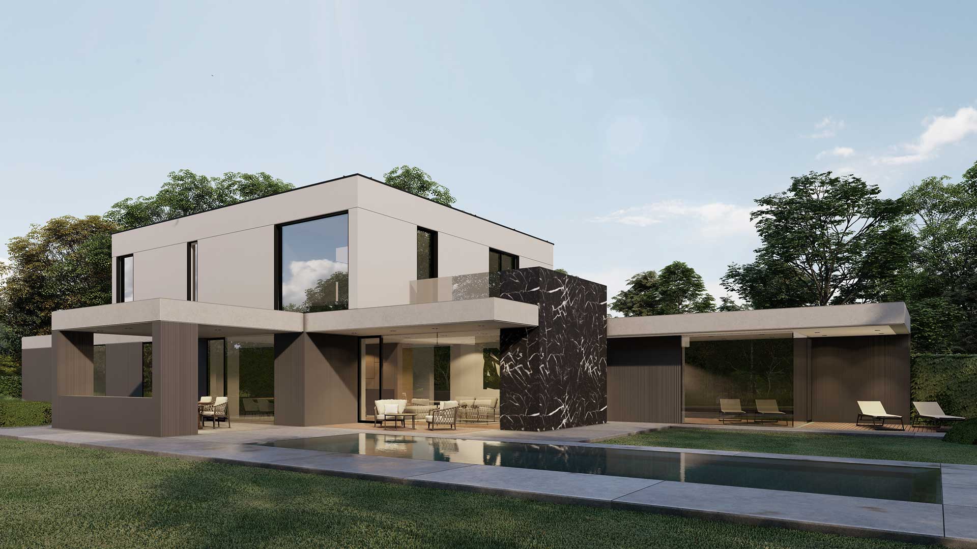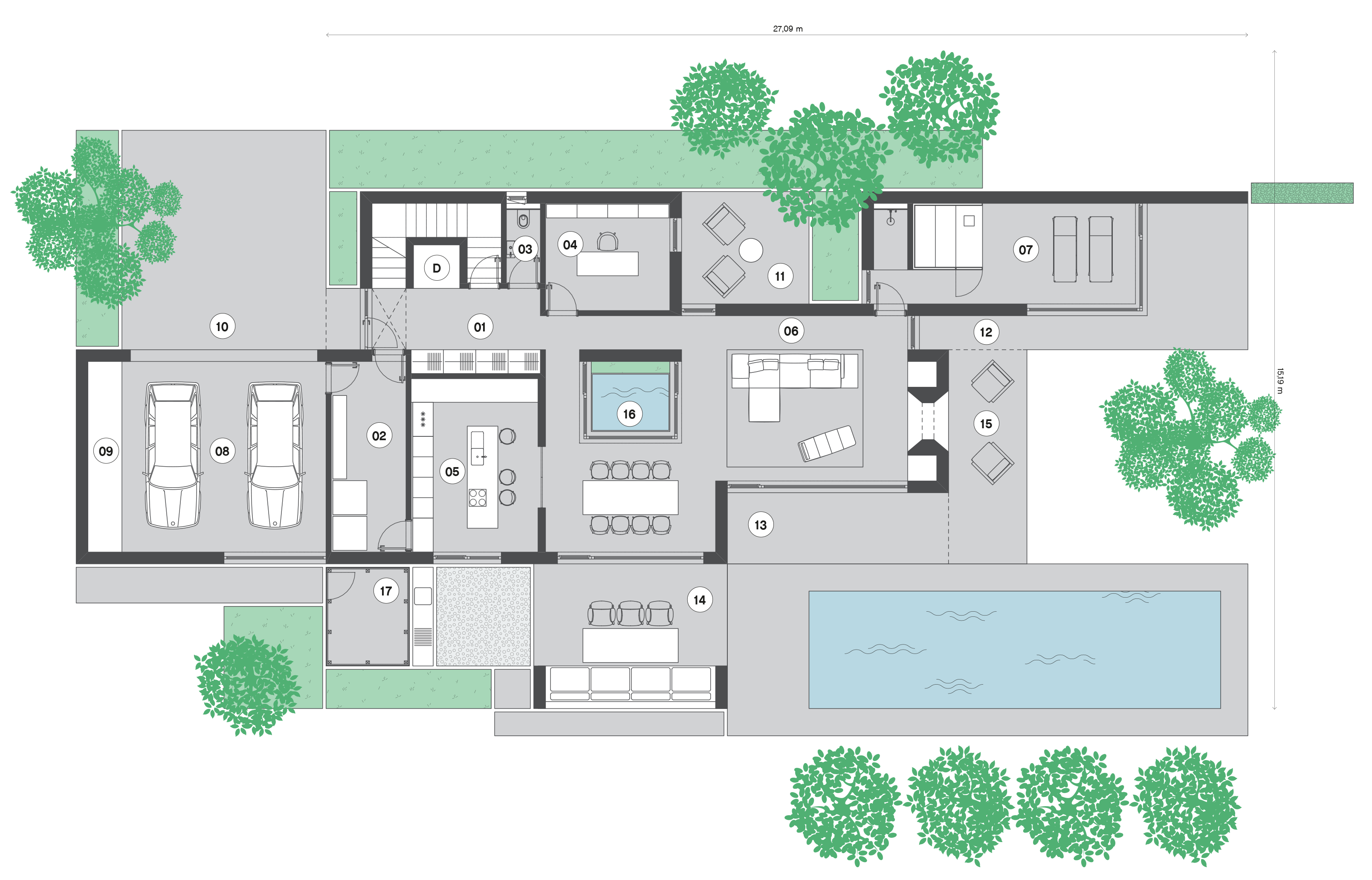 Der gegliederte zweigeschossige Entwurf ergibt sich aus der Verbindung zum Garten. Das Erdgeschoss ist für den Wohnraum vorgesehen, das Obergeschoss verfügt über die Schlafräume. Die Ausrichtung erstreckt sich nach Süden und Osten. Schon beim Betreten, schafft der zweigeschgossige Raum ein besonderes Erlebnis. Die Treppen sind so konzipiert, dass ein Aufzug problemlos in der vertikalen Öffnung errichtet werden kann. Der zentrale Wohnbereich verfügt über einen zweigeschossigen Atriumbereich mit einer grünen Wand und einem Wassermotiv. Es stellt den Kern des Hauses dar und bietet Belichtung, eine klangliche Kulisse und viel Grün im Herzen des Gebäudes. Die Küche kann nach Bedarf geschlossen werden und öffnet sich zur Sommerküche und zum zentralen, überdachten Wohnbereich. Im Erdgeschoss befindet sich auch ein Wellnessbereich mit einem Fitnessraum, welches eine direkte Verbindung zum Garten und zum Wassermotiv bietet. Die Gestaltung der oberen Etage ist flexibel nach den Wünschen der Bewohner. Die Gestaltung der Umgebung schafft zusammen mit dem Gebäude unterschiedliche Ambiente.