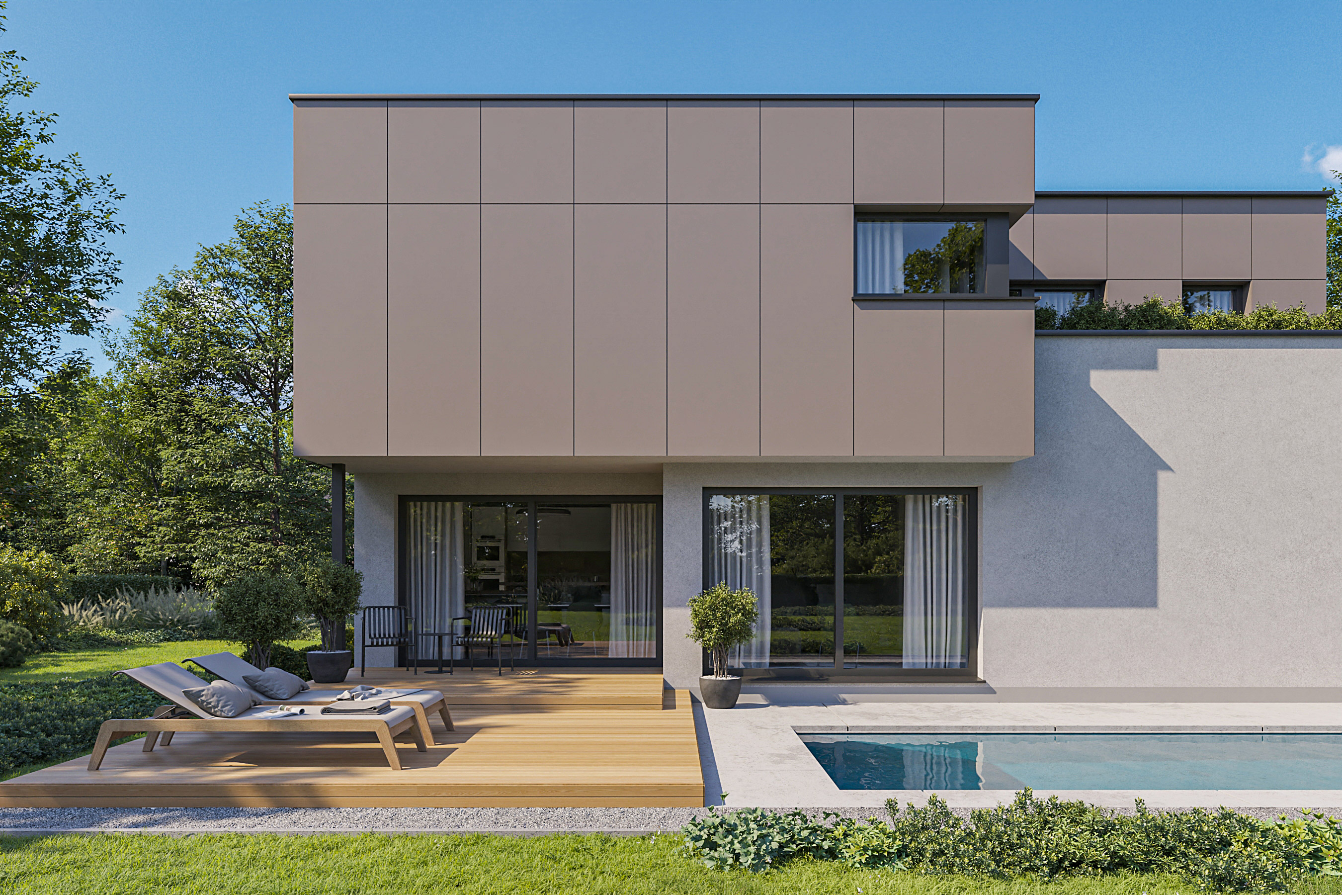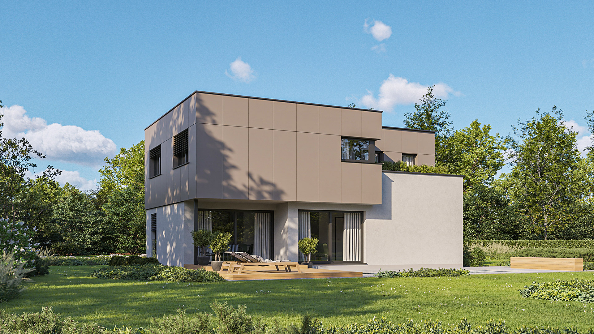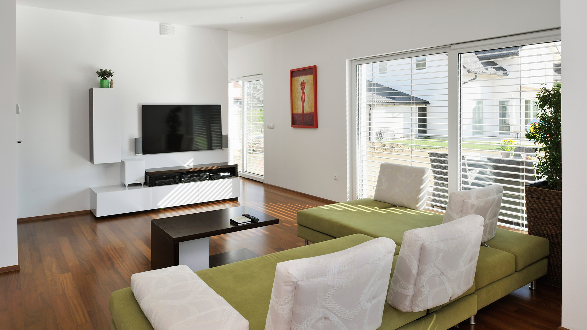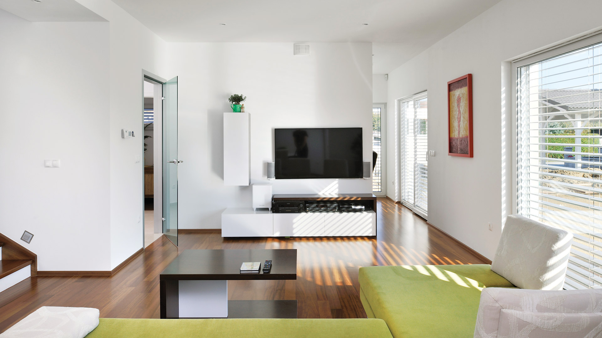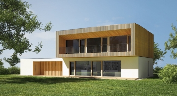 Zusätzlich zu seiner modernen Architektur besticht das Haus durch seine ausgezeichnete Energieeffizienz. Das sehr gut isolierte Flachdach reduziert den Wärmeverlust des Hauses enorm. Der Grundriss ist so konzipiert, dass sich die Räume nach Süden und Westen öffnen. Durch die großen Glasflächen wird die riesige, teilüberdachte Terrasse in den Lebensraum der Hausbewohner mitintegriert – ein wesentlicher Wohlfühlfaktor vor allem während der warmen Tage.