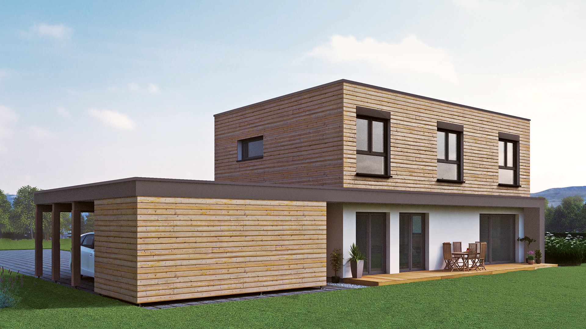 Das Flachdach versetzt das Primus in den modernen Bauhausstil und gewährleistet volle Raumnutzung im Obergeschoss ohne Dachschrägen. Ein ganz besonderes Highlight bietet die Option der Holzschalung.