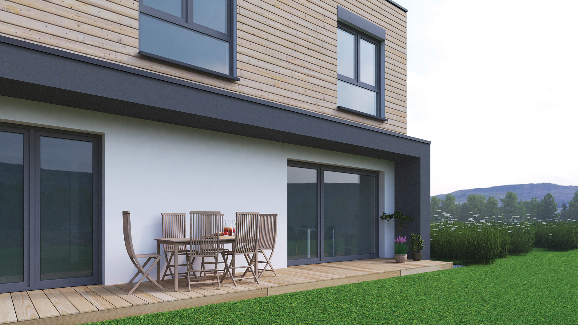 Das Flachdach versetzt das Primus in den modernen Bauhausstil und gewährleistet volle Raumnutzung im Obergeschoss ohne Dachschrägen. Ein ganz besonderes Highlight bietet die Option der Holzschalung.