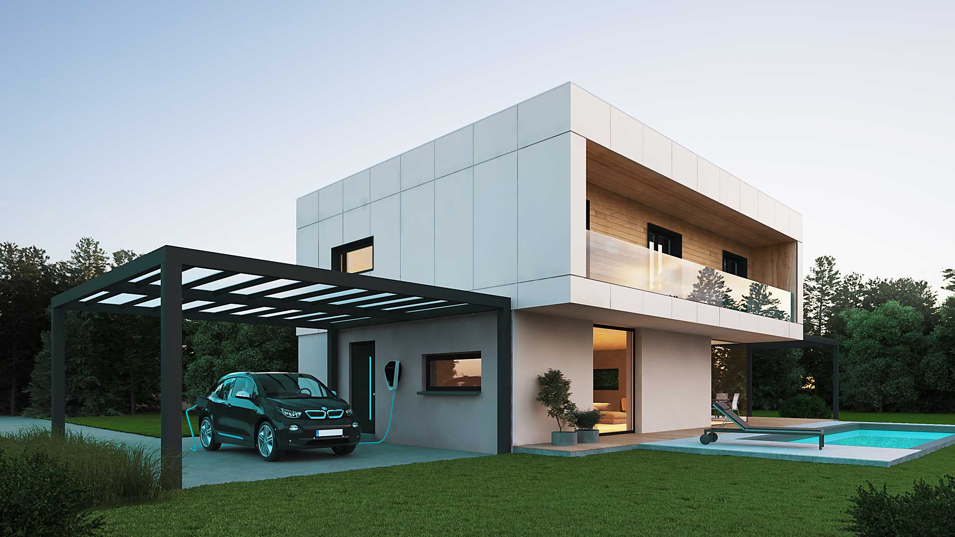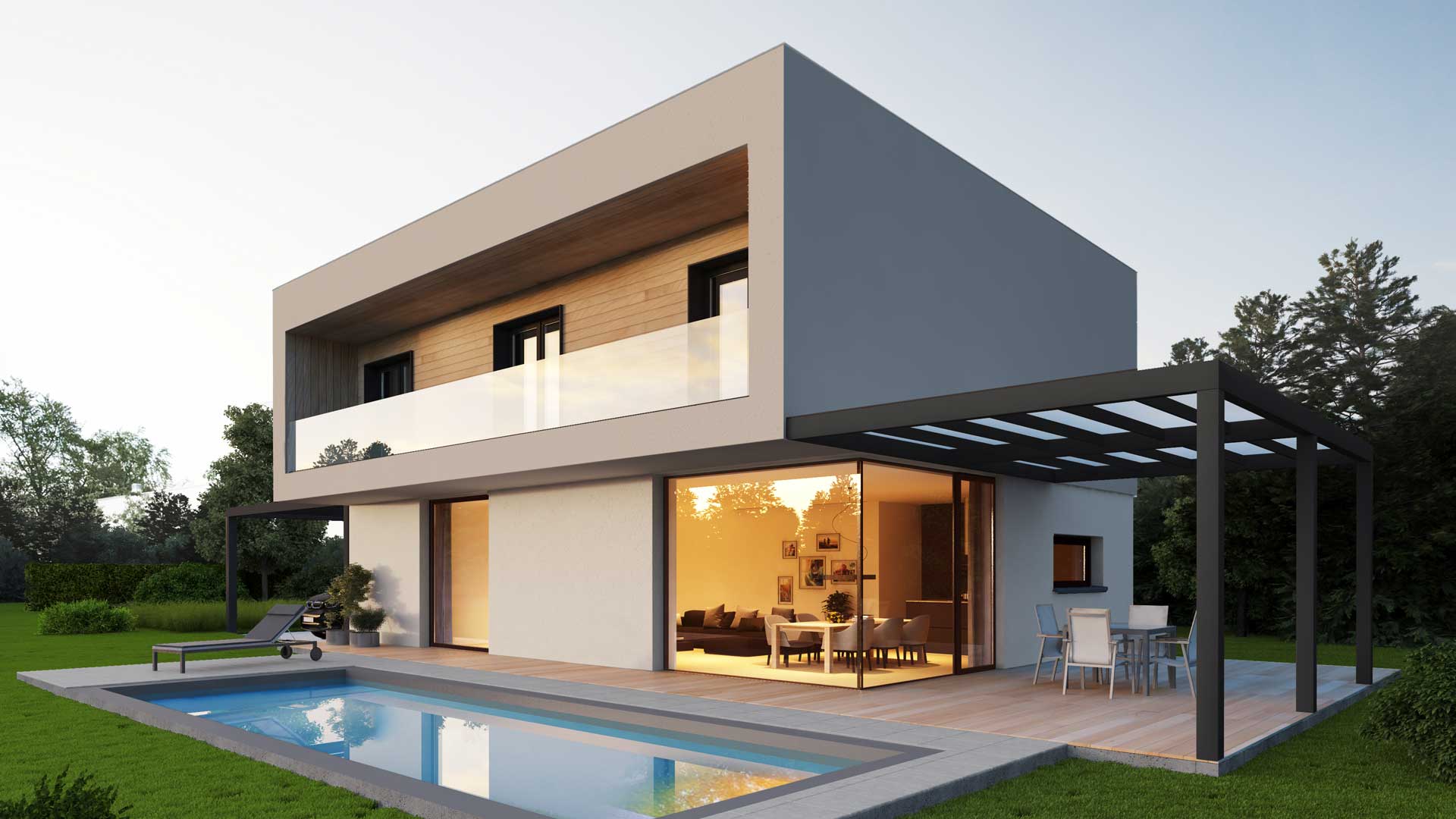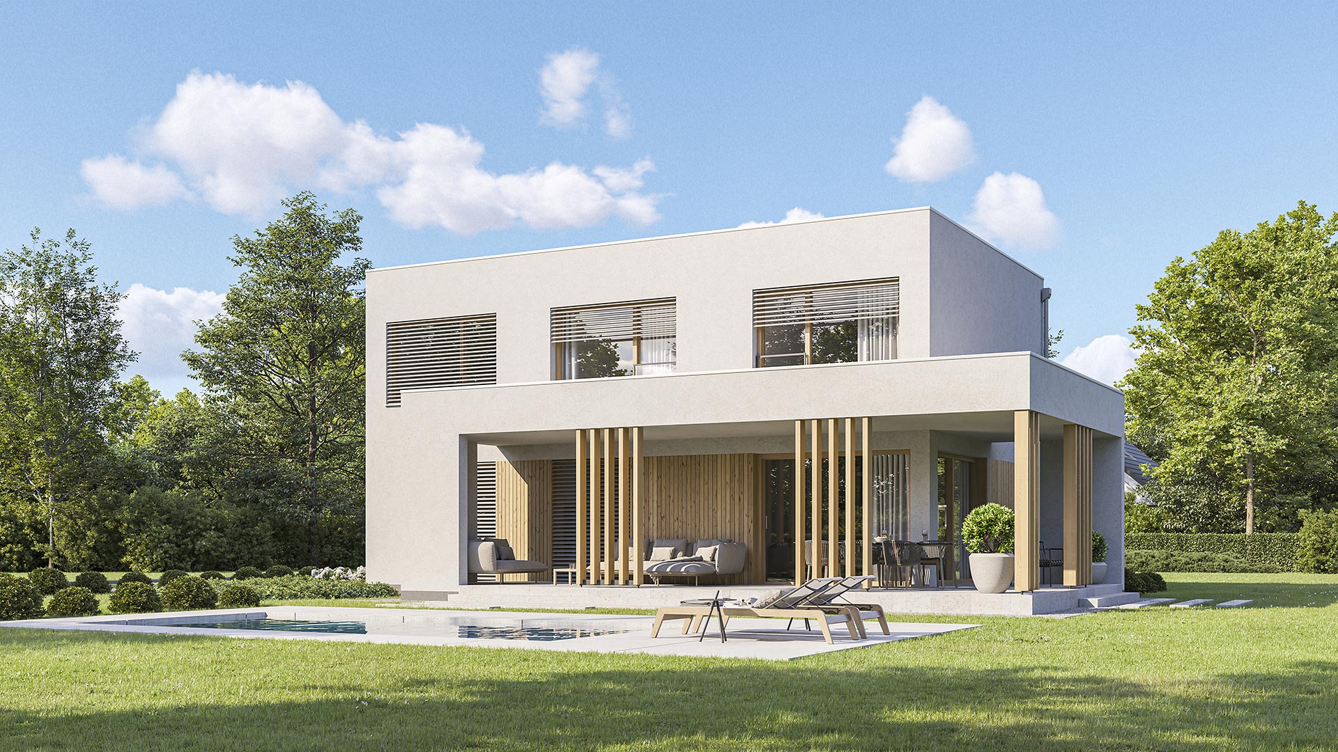Das Flachdach versetzt das Primus in den modernen Bauhausstil und gewährleistet volle Raumnutzung im Obergeschoss ohne Dachschrägen. Ein ganz besonderes Highlight bietet die Option der Holzschalung.