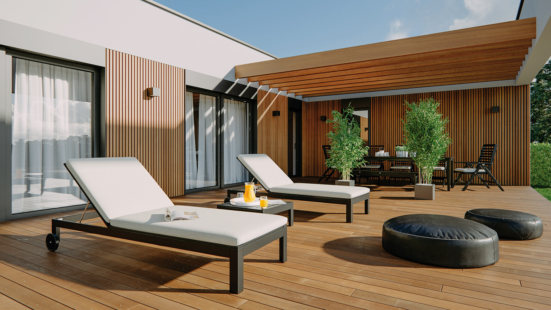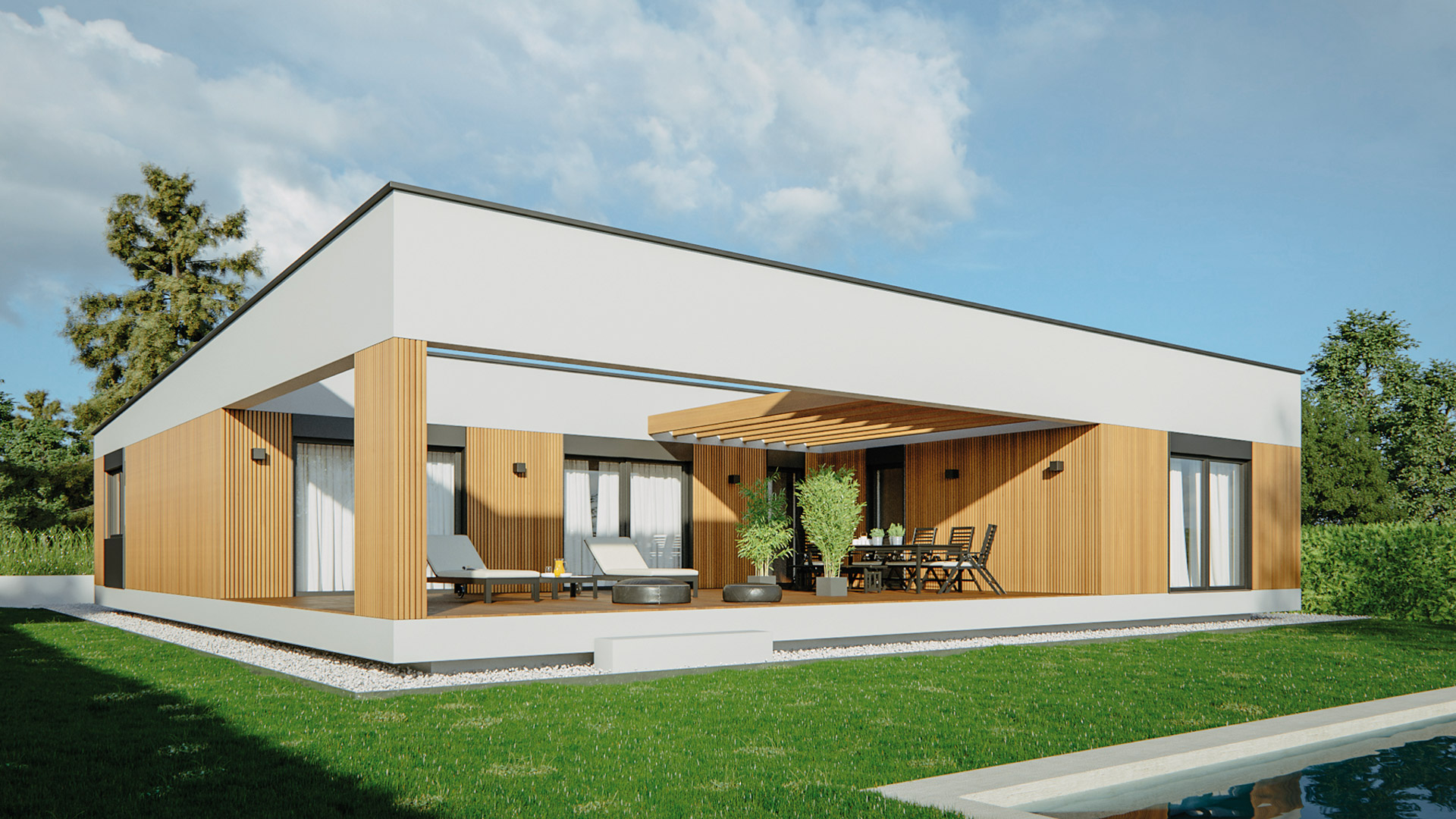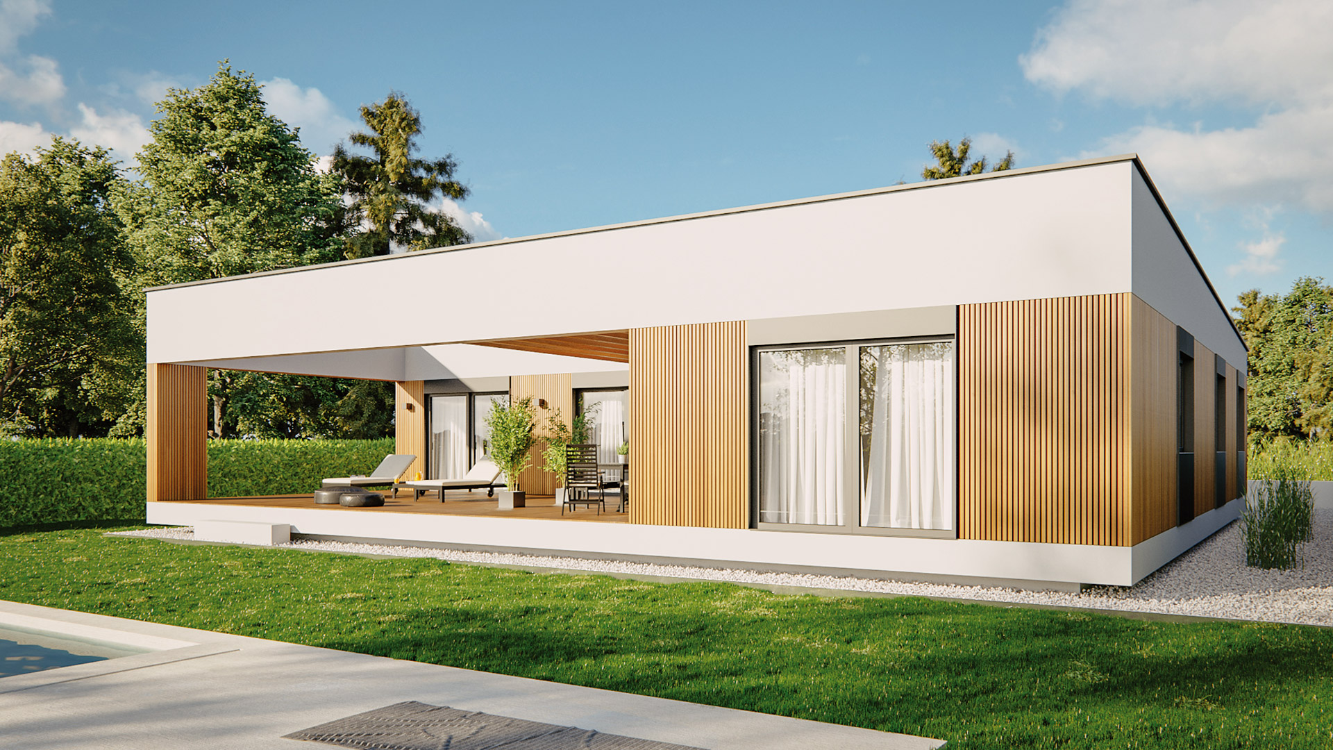 Die Schwerpunkte des Hausmodells Terra 158 liegen, ähnlich wie beim Hausmodell 131, auf einer großzügigen Raumaufteilung und maximalen Komfort. Die Zimmer sind entsprechend großzügiger geplant als in der kleineren Version. Das Haus verfügt über 1 Elternschlafzimmer mit angrenzdem Badezimmer sowie 2 Kinderzimmer, ebenfalls mit einem eigenen Badezimmer. Ein zusätzlicher Raum direkt beim Eingang kann entweder als Arbeits- oder Gästezimmer genutzt werden.