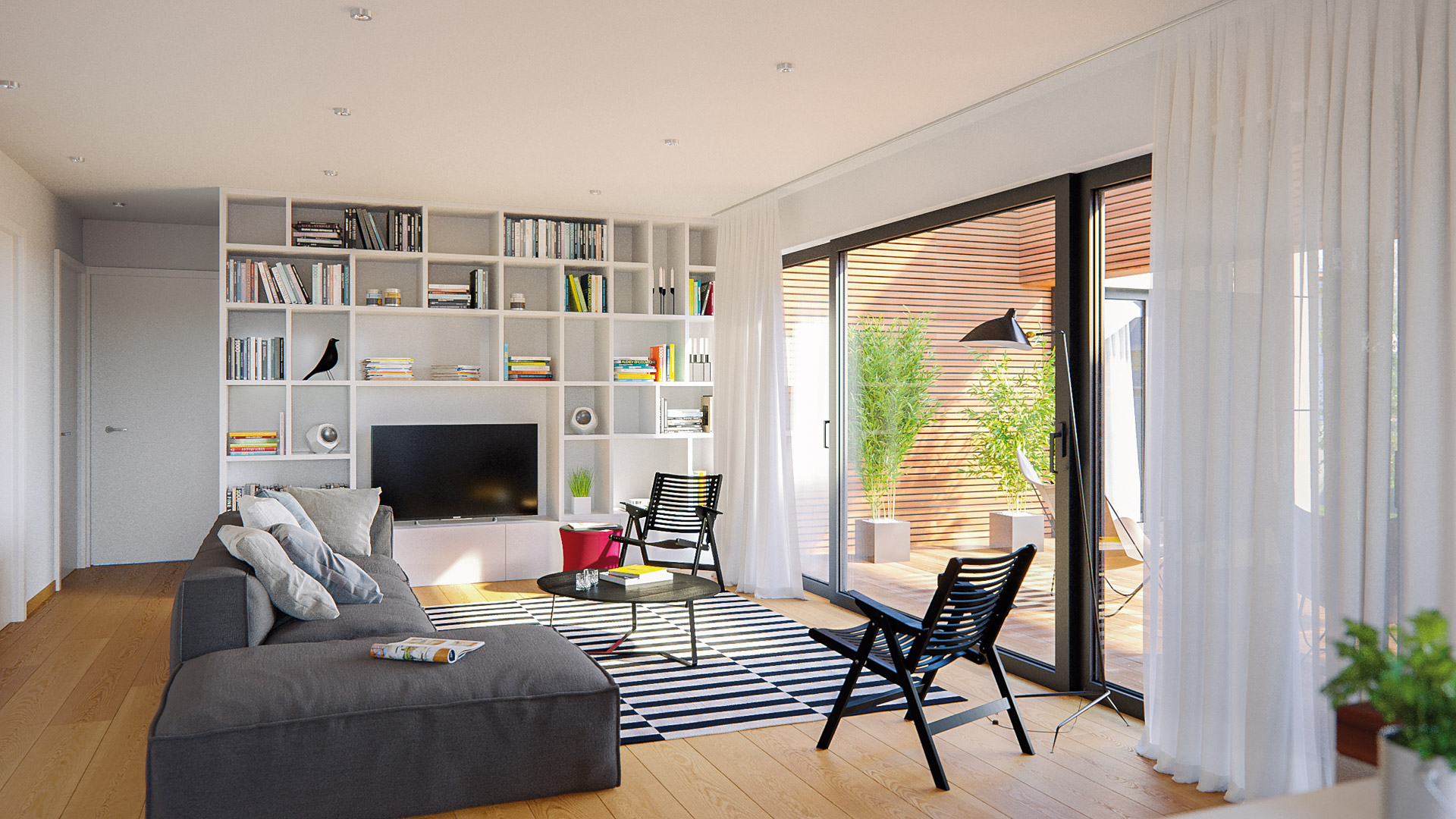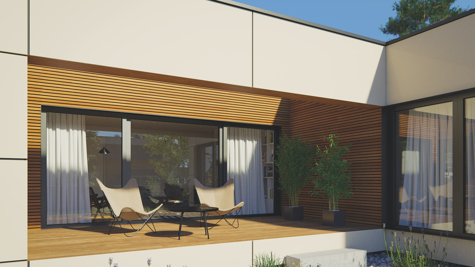 Das Haus Terra 143 ist ein Bungalow, der sich vor allem durch den zentralen Wohnbereich und der riesigen Terrasse auszeichnet. Der L-förmige Wohn-Essbereich mit integrierter Küche ist sehr offen und hell gestaltet. Sowohl das Elternschlafzimmer als auch die beiden Kinderzimmern sind jeweils mit einem eigenen Bad ausgestattet. Ein zusätzliches Zimmer direkt beim Eingangsbereich ermöglicht die Nutzung als Büro oder Gästezimmer. Das Haus ist entweder mit Flach- oder Pultdach, aber auch mit Walmdach erhältlich.