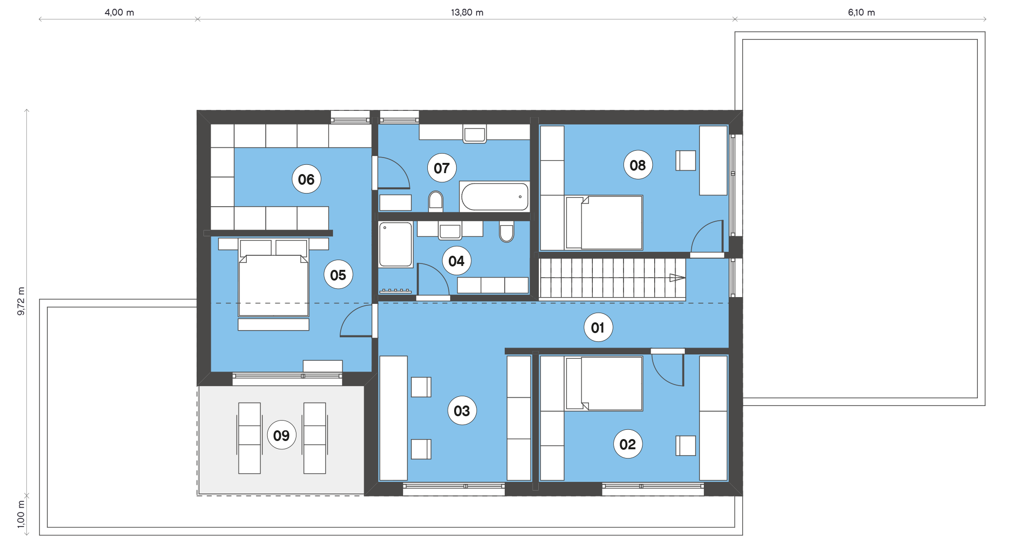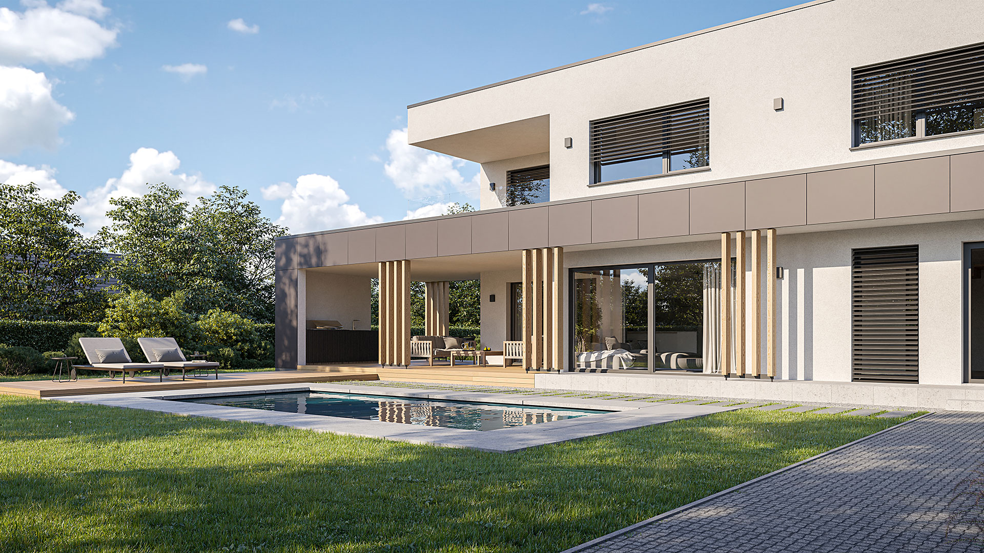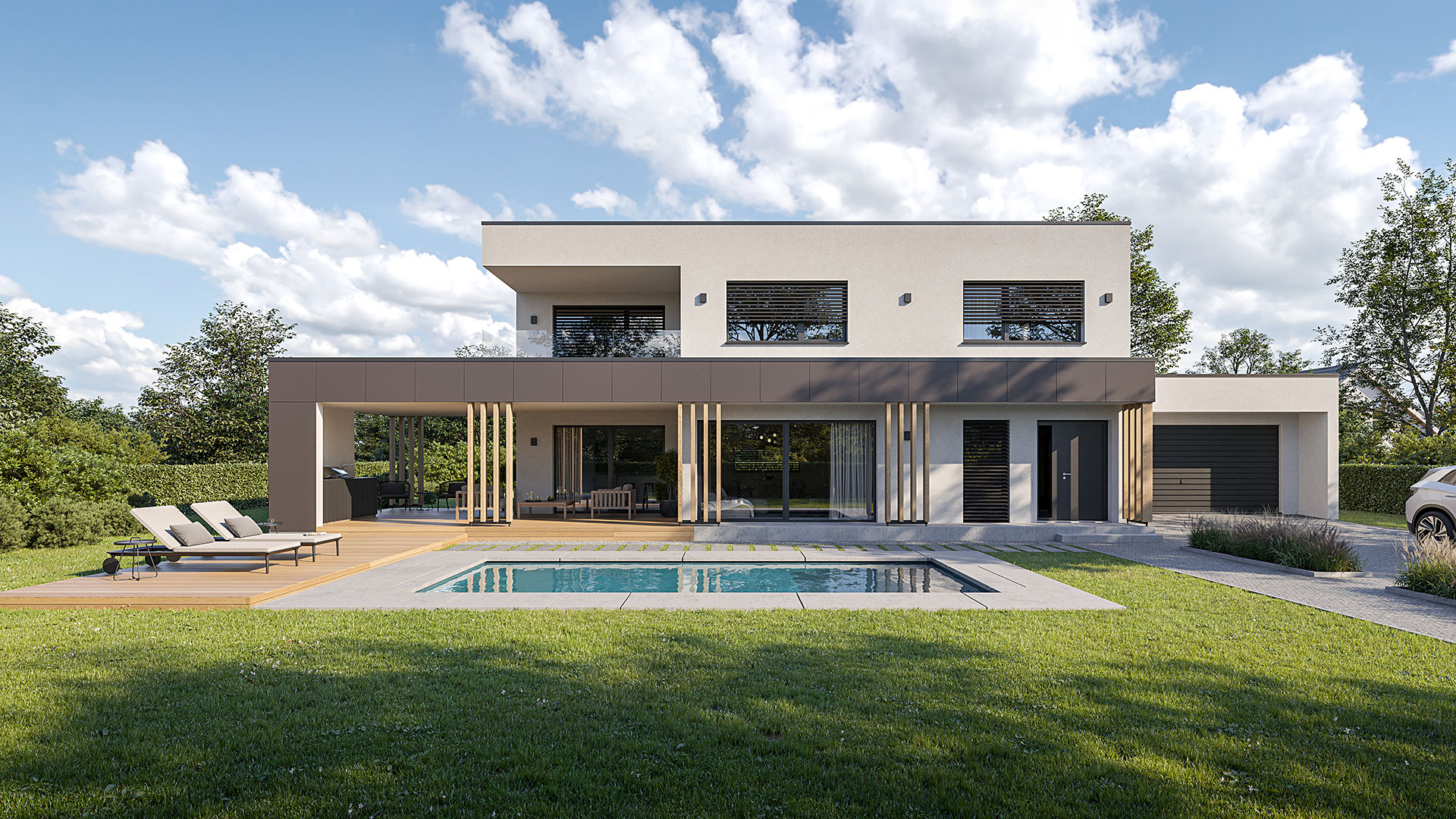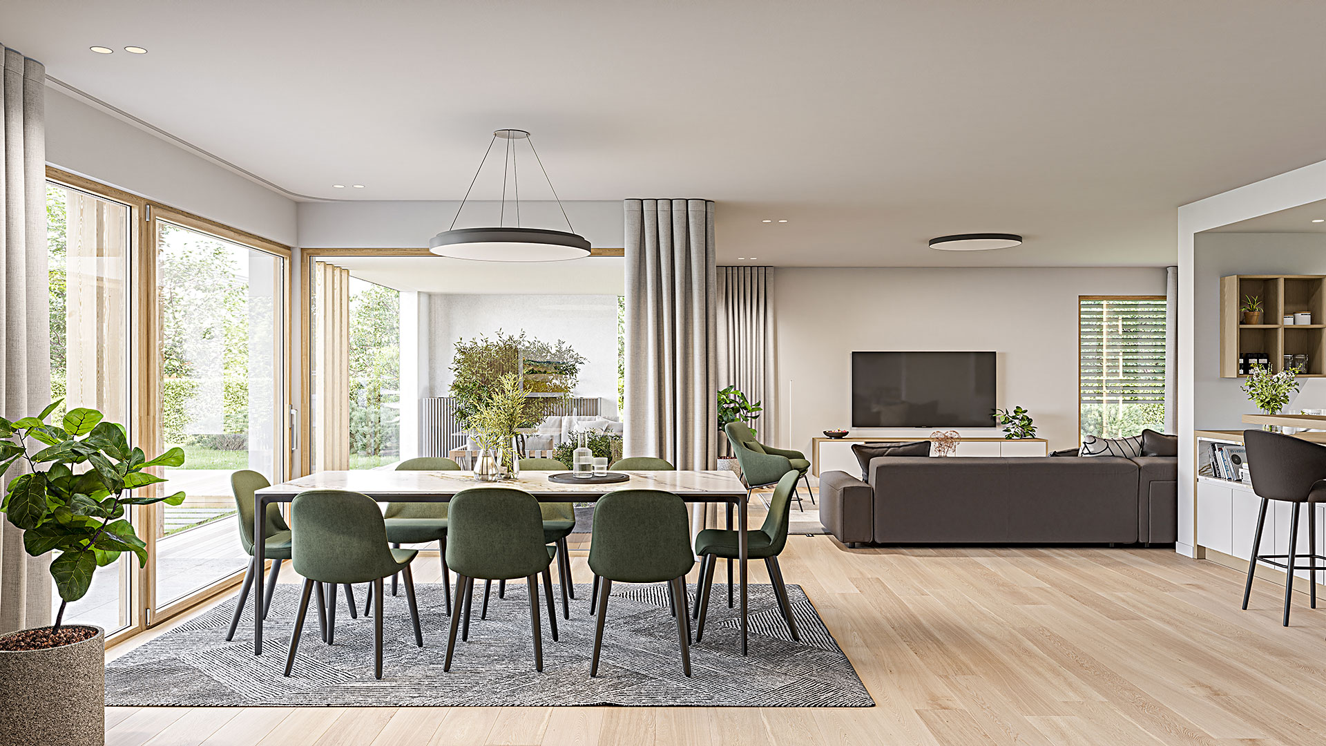 Der verspielte Grundriss mit akzentuierter Südausrichtung verfügt über 200 Quadratmeter Wohnfläche. Die 48 Quadratmeter überdachte Terrasse sorgt für zusätzlichen Komfort und bietet Zugang zum großzügigen Erdgeschoss. Die hellen Wohnräume sind mit der überdachten Terrasse verbunden, die im Sommer als Wohnzimmer dienen und zu jeder Jahreszeit einen angenehmen Schutz bieten. Der Zugang zum Stockwerk erfolgt über eine offene, gerade Treppe, die an ihrem Ende mit einem Panoramafenster mit Blick auf die Landschaft endet. Geräumige Kinderzimmer, ein gemeinsamer Aufenthaltsbereich und ein eigenes Bad bieten viel Komfort für die jüngeren Mitglieder. Die komfortable Schlafsuite bietet Zugang zu einer diskreten Außenterrasse.