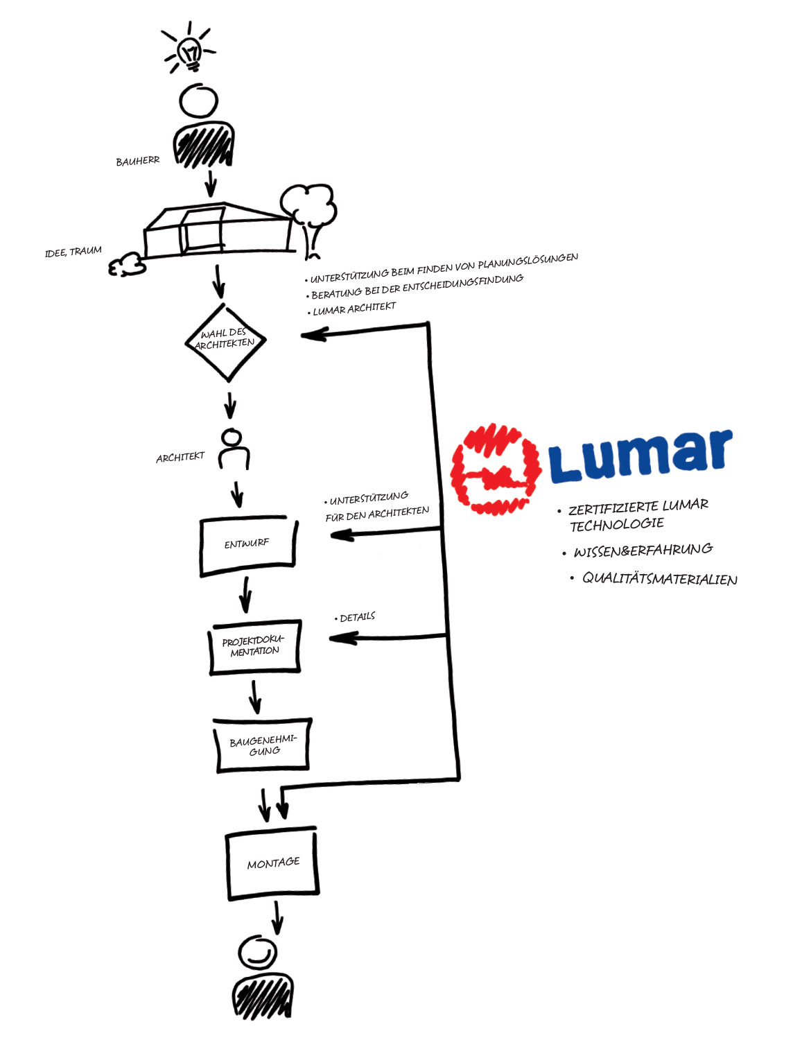 Am Anfang steht immer ein Traum. Ein Traum vom perfekten, individuellen Haus, ganz nach den eigenen Vorstellungen geplant und errichtet. Sie haben konkrete Vorstellungen, wie Ihr Traumhaus aussehen soll, welche Anforderungen es erfülllen soll, welche Funktionalitäten es aufweisen soll. Vielleicht haben Sie auch schon Skizzen gemacht? Aufgrund der individuellen Baukompetenz von Lumar und unserer erfahrenen Mitarbeiter können wir Sie von Beginn an unterstützen. Wir helfen Ihnen bei der Wahl des Architekten, der Sie bei Ihren Ideen unterstützen wird. Oder Sie lassen uns schon einen fertigen Plan zukommen und wir helfen Ihnen bei der Wahl der Materialien. Wie bei der Gestaltung sind uns auch bei der Ausführung keine Grenzen gesetzt.