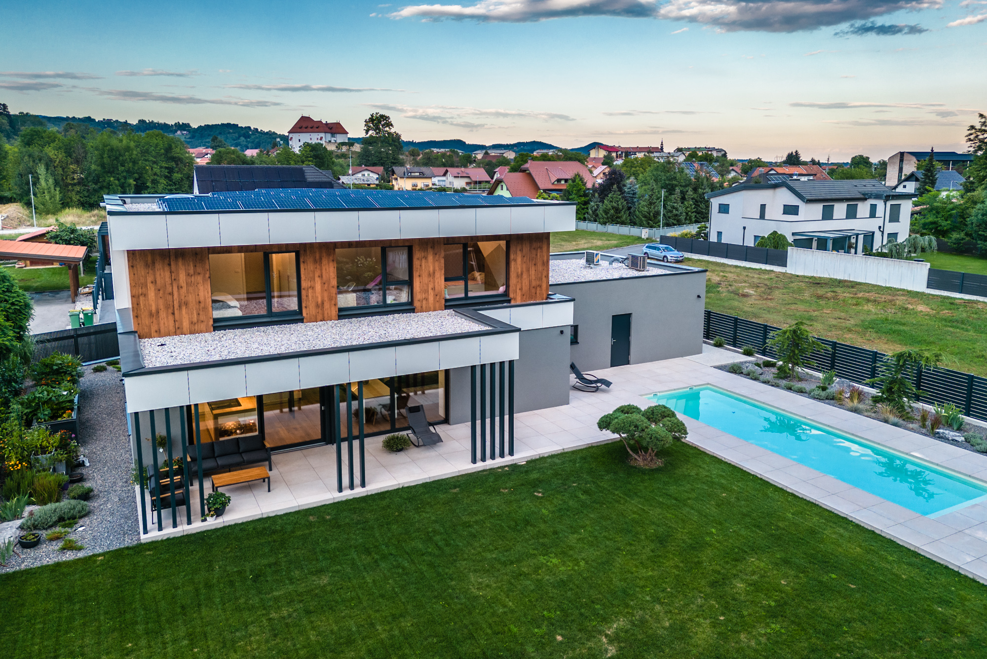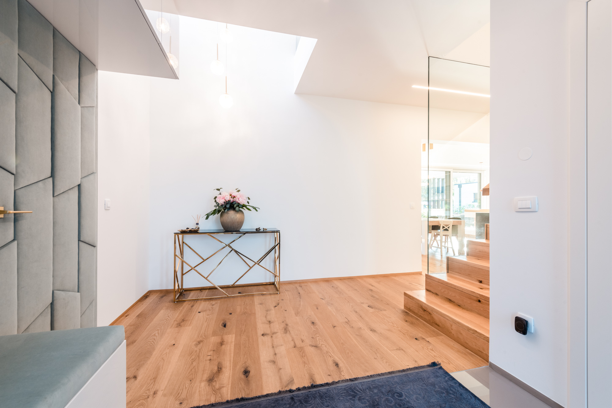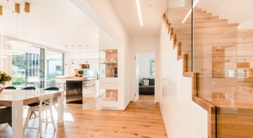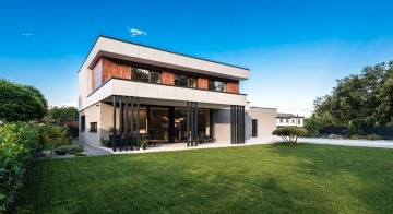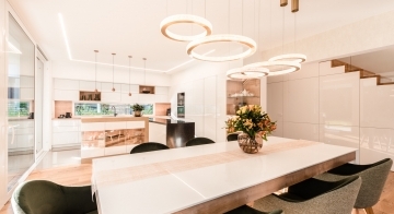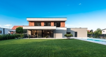 Die Gestaltung des Erdgeschosses zeichnet sich durch eine Trennung der funktionalen Bereiche aus. Großzügigkeit vermittelt bereits der Eingangsbereich. Die Küche und das Esszimmer können vom Wohnzimmer getrennt werden und ermöglichen dadurch eine ruhige Rückzugsmöglichkeit. Das Obergeschoss bietet sogar einer 5-köpfigen Familie eine gemütliche und durchdachte Raumaufteilung. Ein eigener Elternbereich besticht durch Schlafzimmer mit begehbarem Schrankraum und einem großzügigen Bad. Ein weiteres Bad ist den 3 Kinderziemmern zugeteilt. Eine Dachterrasse erweitert im Sommer den Lebensraum im Obergeschoss.