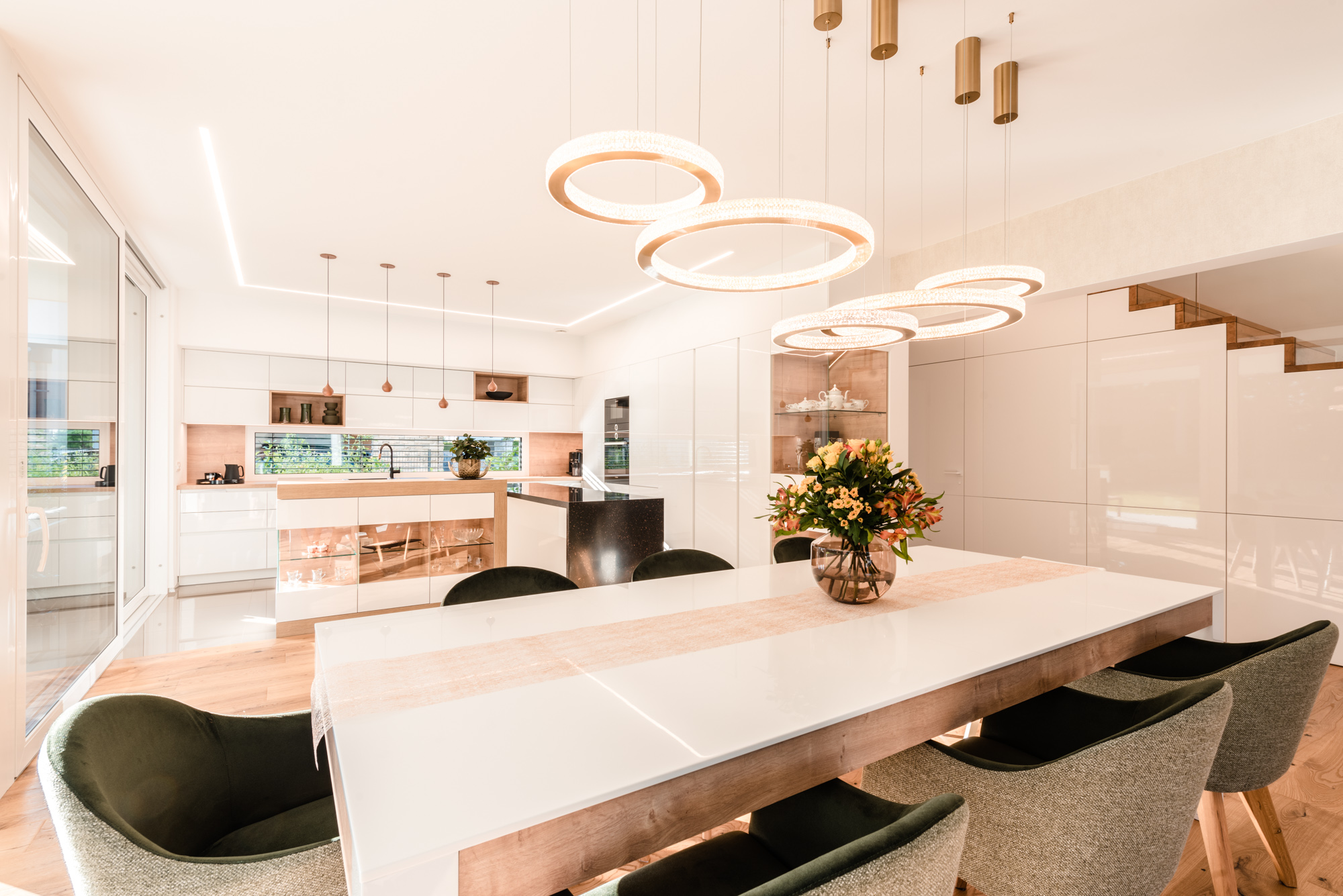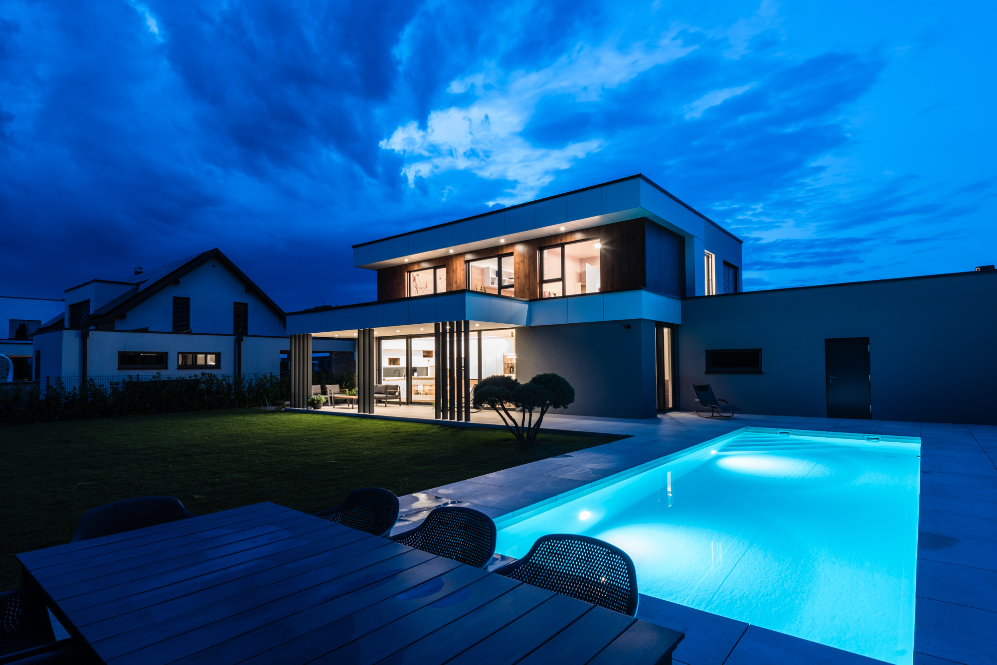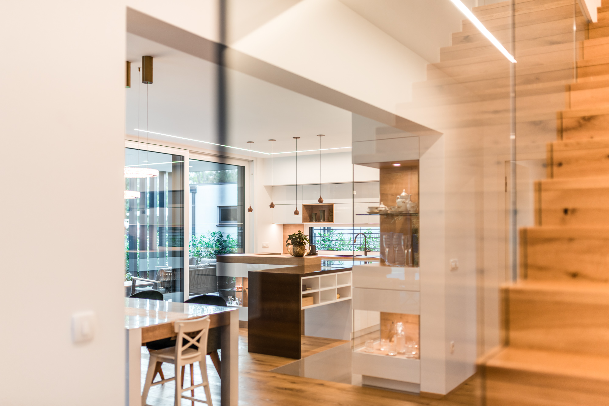 Die Gestaltung des Erdgeschosses zeichnet sich durch eine Trennung der funktionalen Bereiche aus. Großzügigkeit vermittelt bereits der Eingangsbereich. Die Küche und das Esszimmer können vom Wohnzimmer getrennt werden und ermöglichen dadurch eine ruhige Rückzugsmöglichkeit. Das Obergeschoss bietet sogar einer 5-köpfigen Familie eine gemütliche und durchdachte Raumaufteilung. Ein eigener Elternbereich besticht durch Schlafzimmer mit begehbarem Schrankraum und einem großzügigen Bad. Ein weiteres Bad ist den 3 Kinderziemmern zugeteilt. Eine Dachterrasse erweitert im Sommer den Lebensraum im Obergeschoss.
